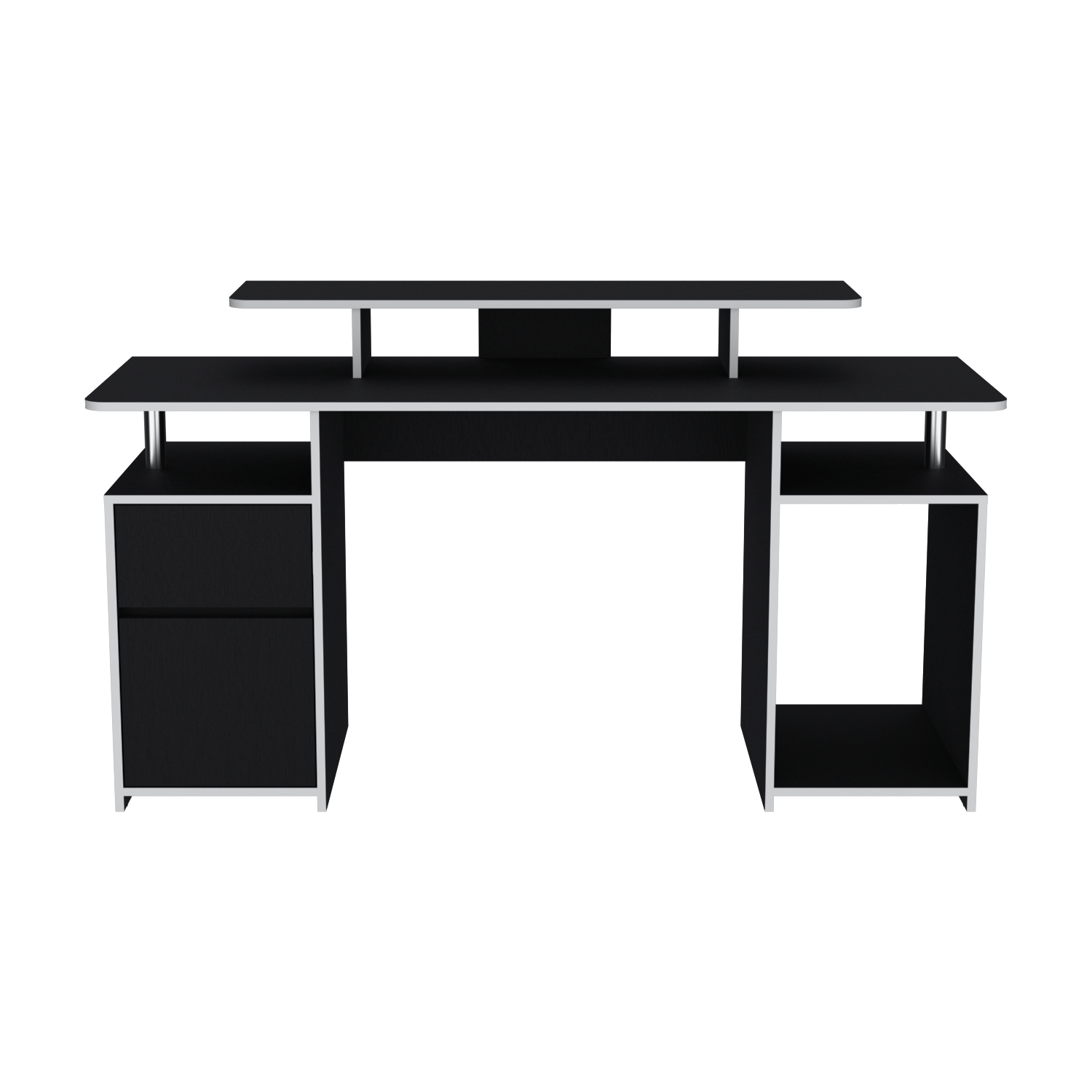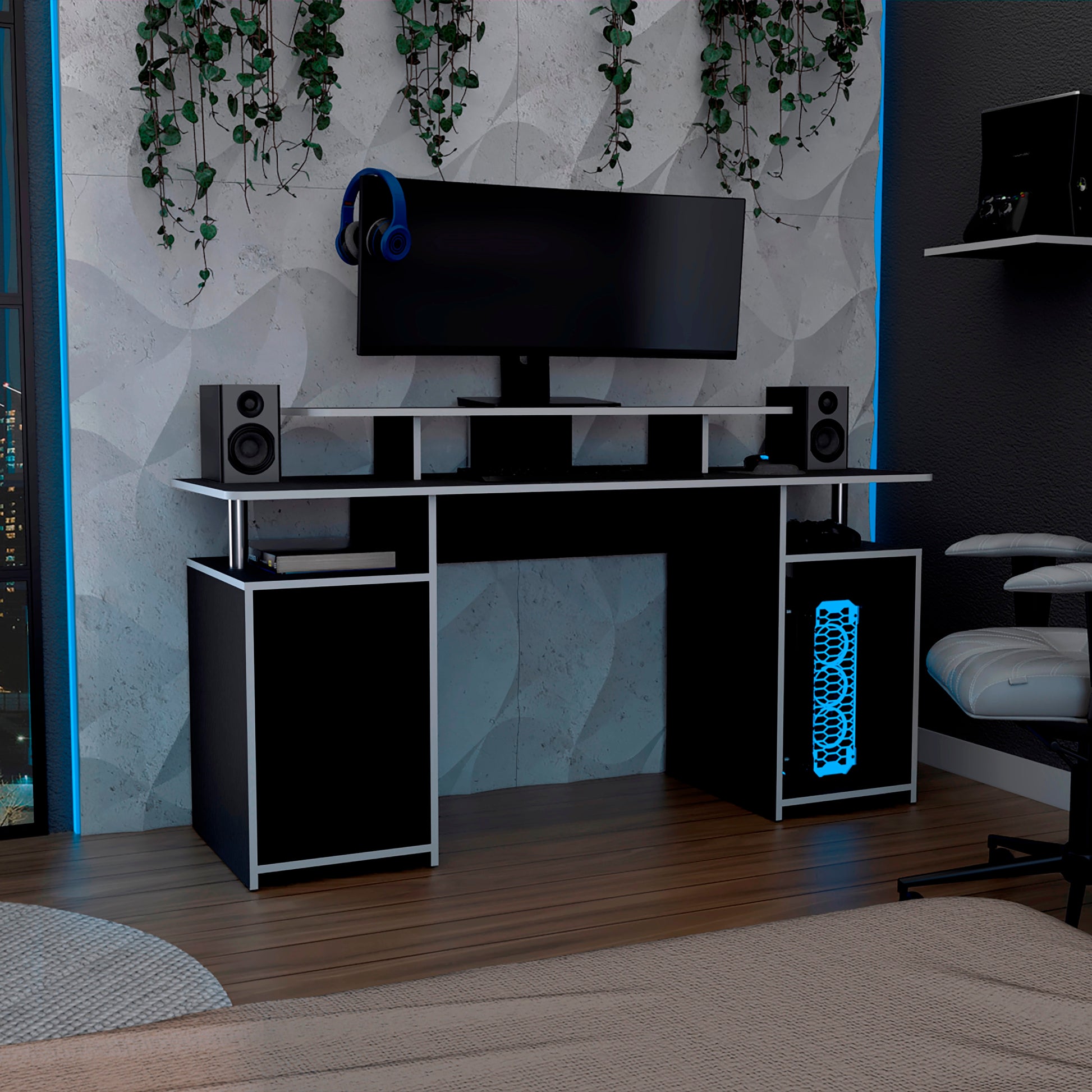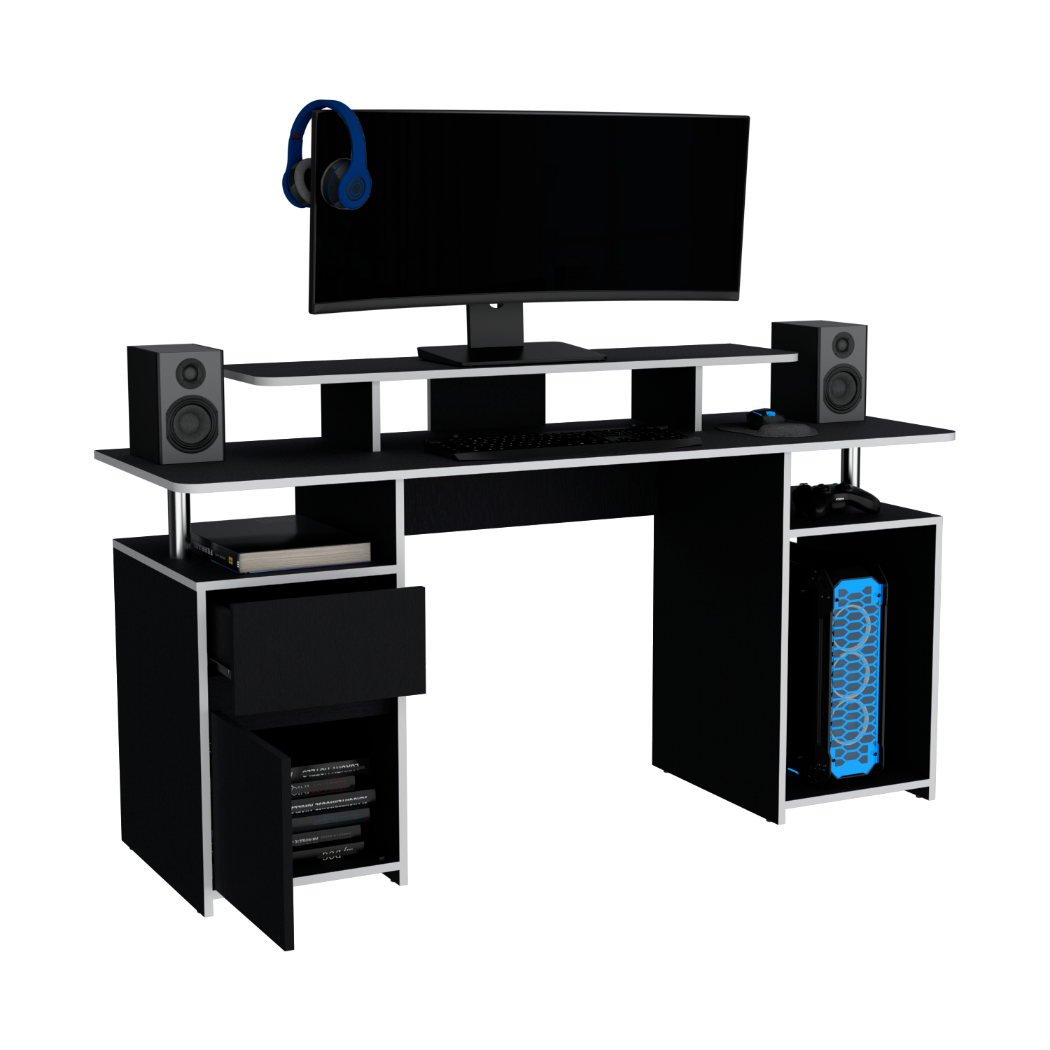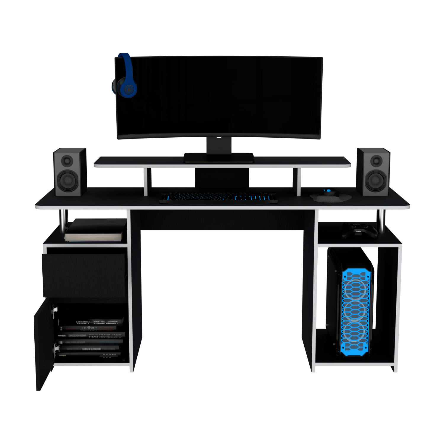 Escritorio Gamer con estante superior grande para monitor, combinacion de colores negro y blanco, soporte para auriculares, una puerta un cajon