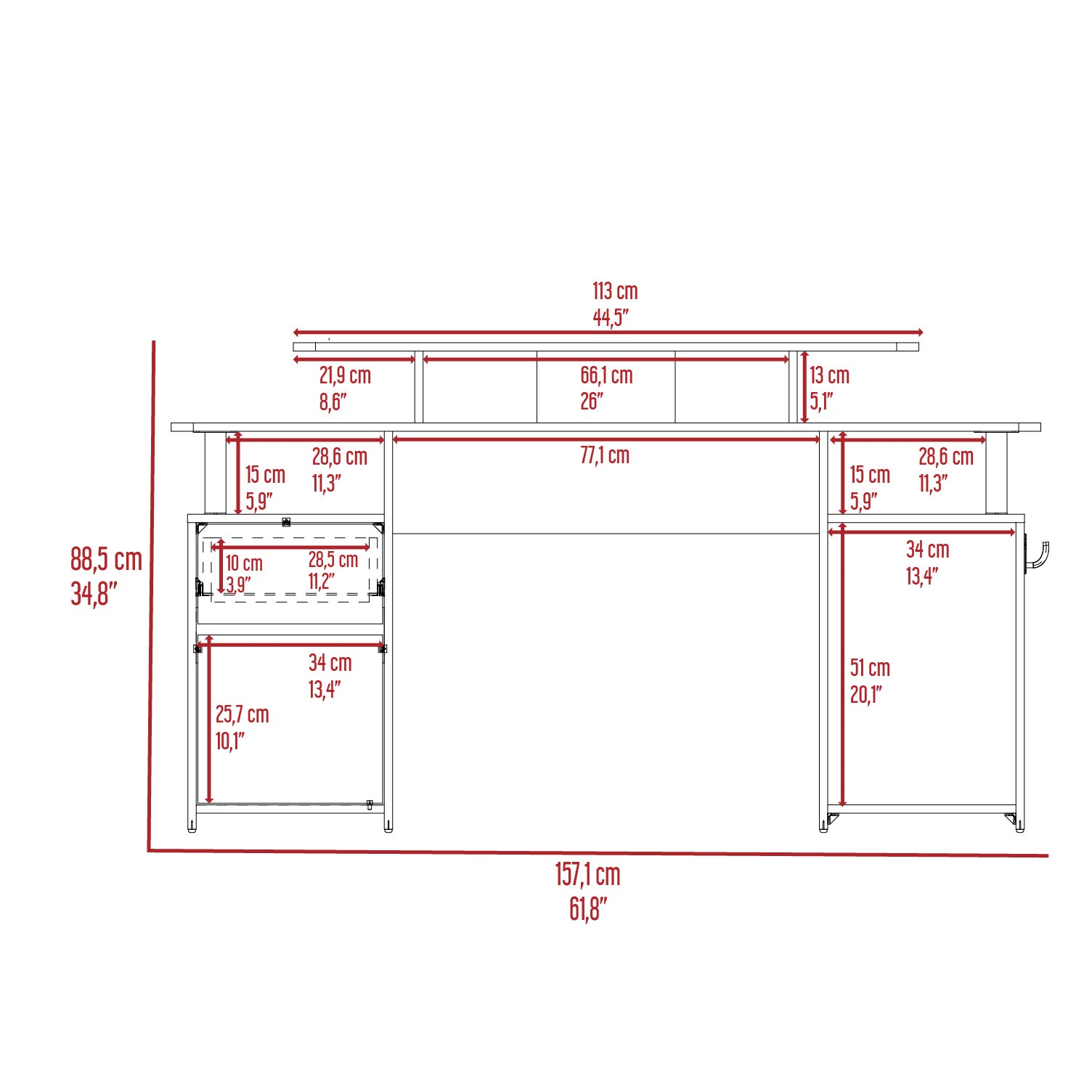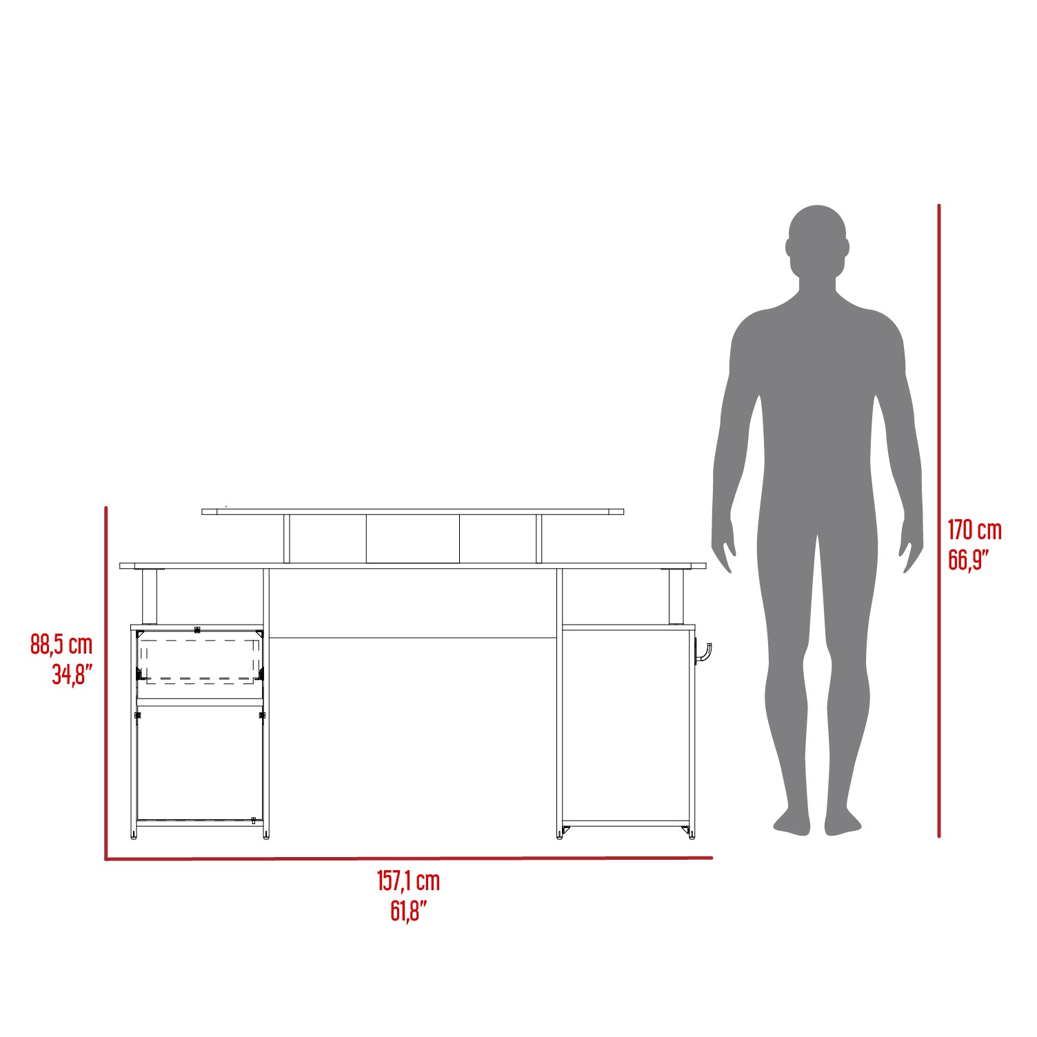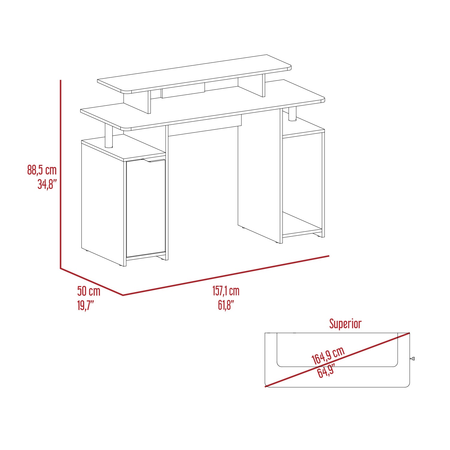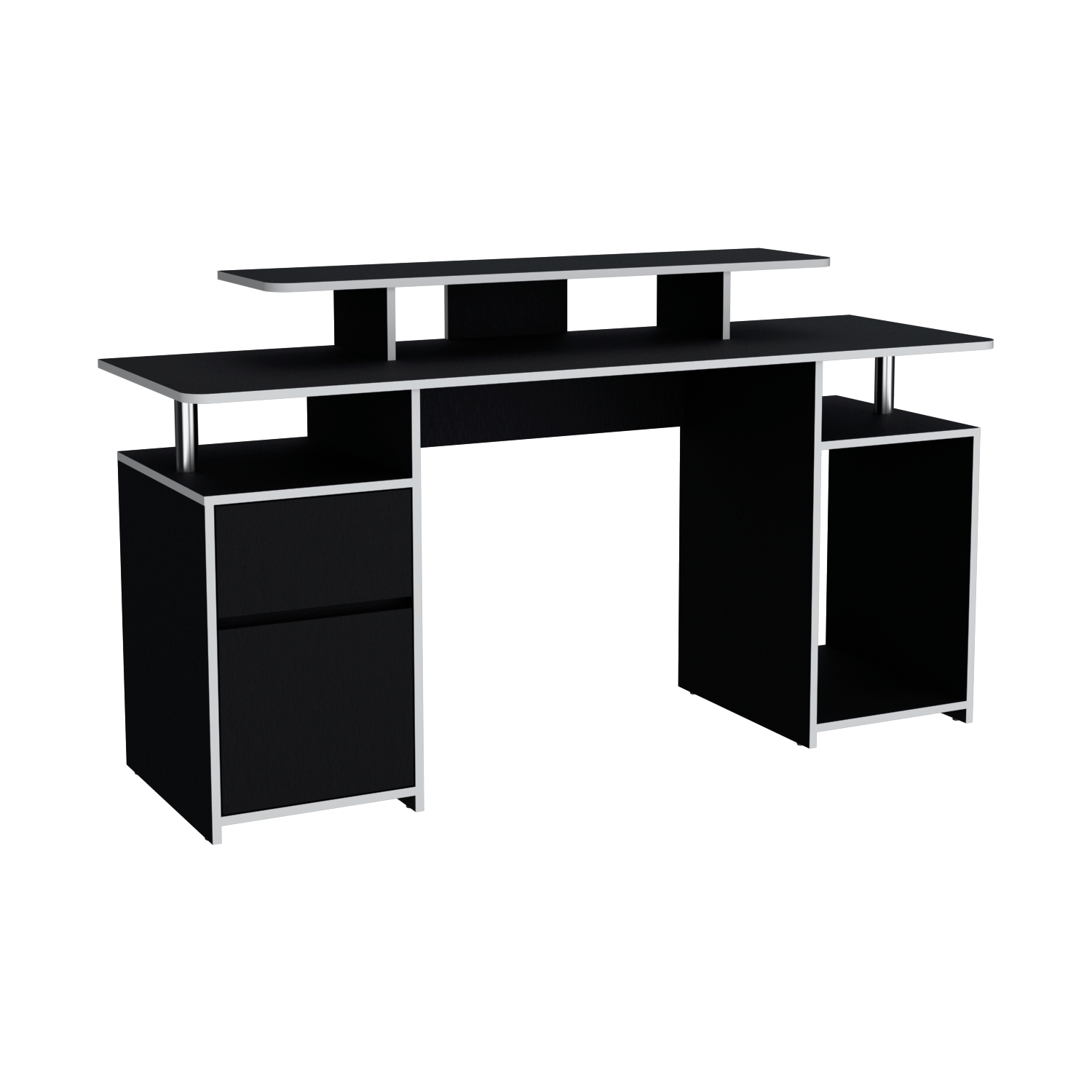 Escritorio Gamer con estante superior grande para monitor, combinacion de colores negro y blanco, soporte para auriculares, una puerta un cajon