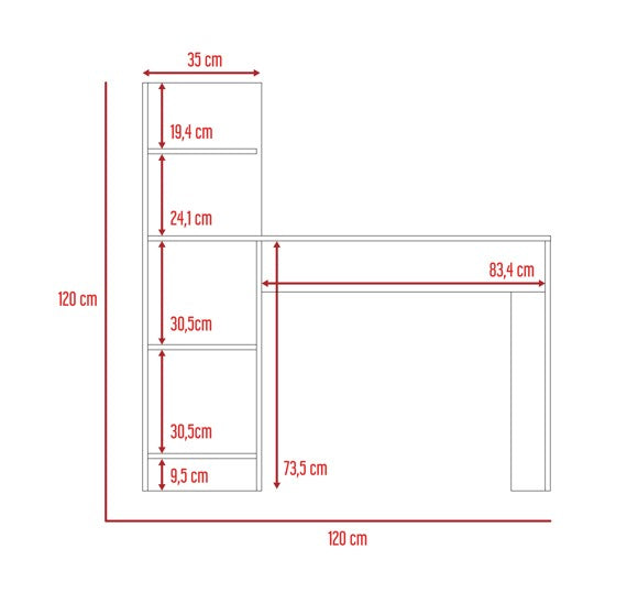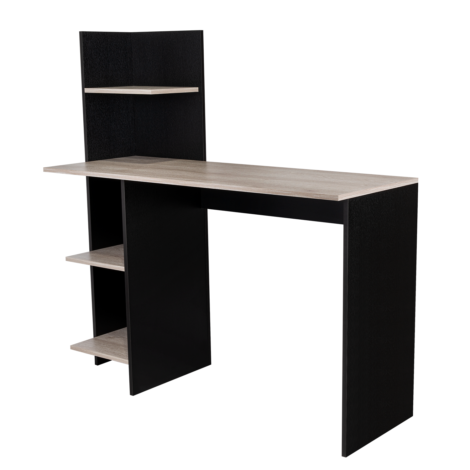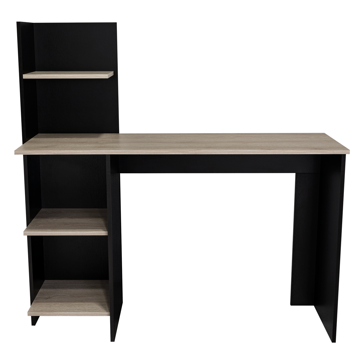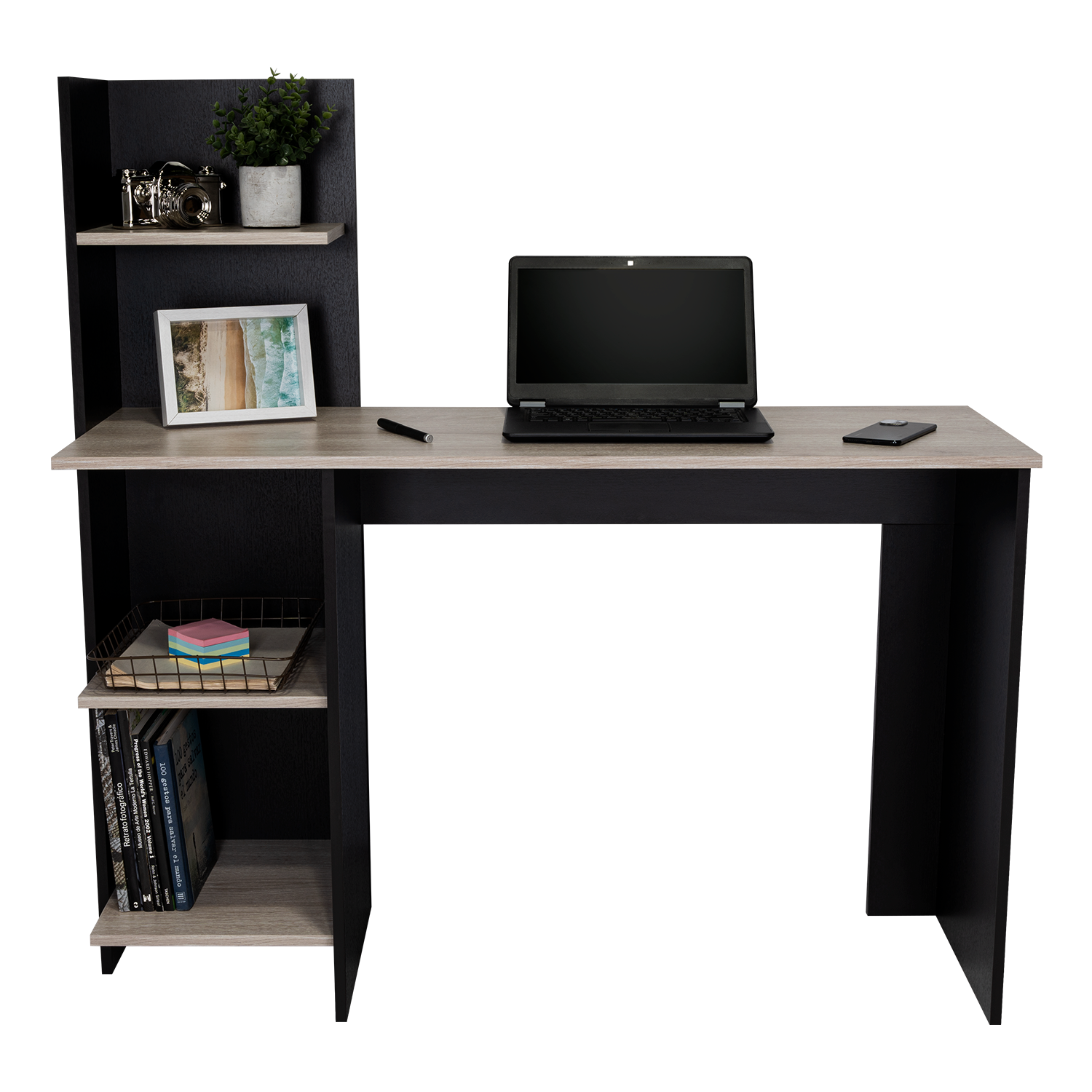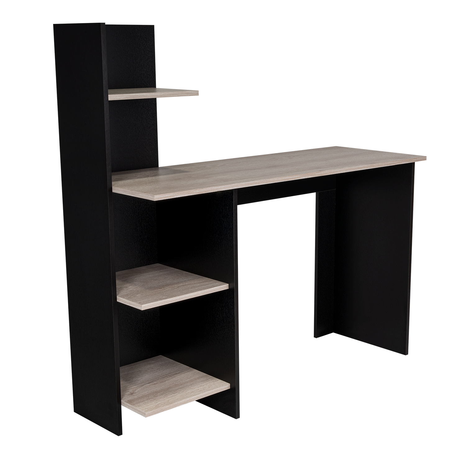 Escritorio con amplia superficie de trabajo, entrepaños para ubicar libros y/o elementos decorativos, combinacion de colores