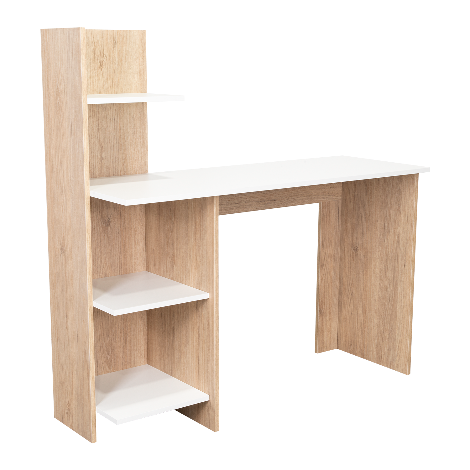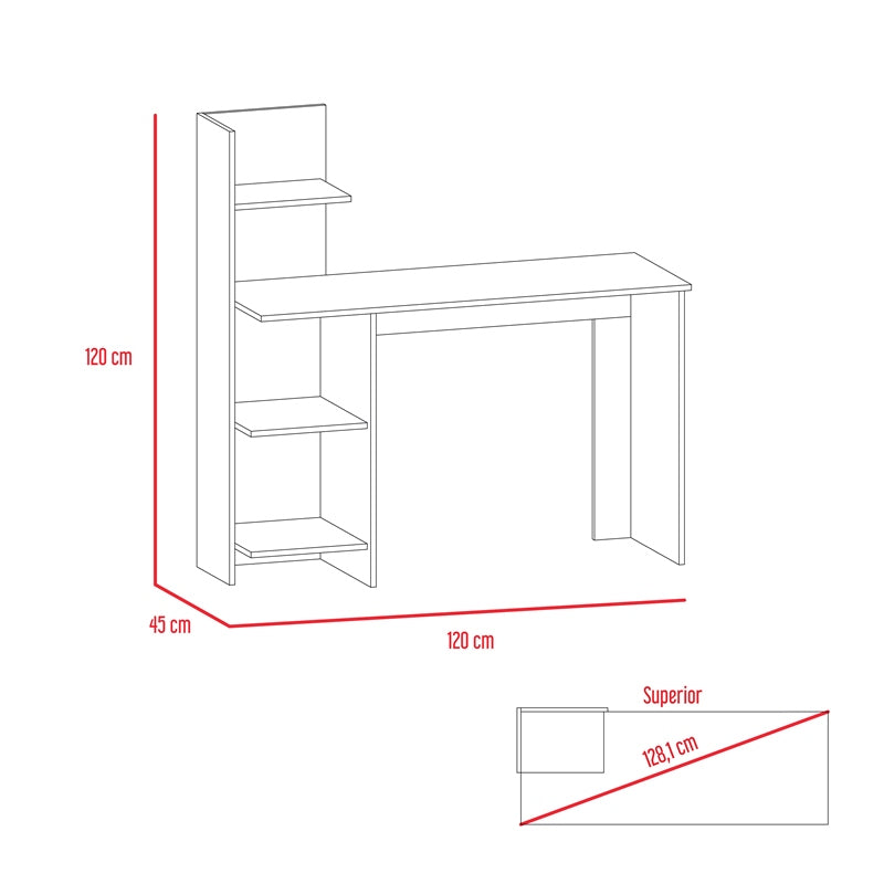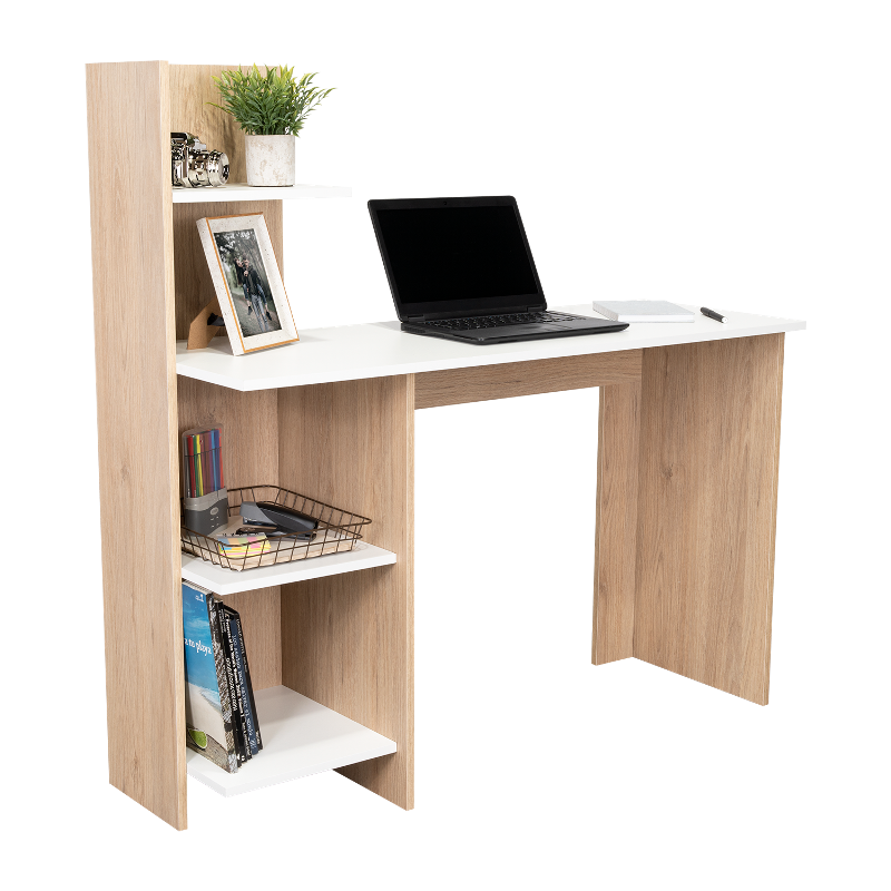 Escritorio 120 con amplia superficie de trabajo, entrepaños para ubicar libros y/o elementos decorativos, combinación de colores