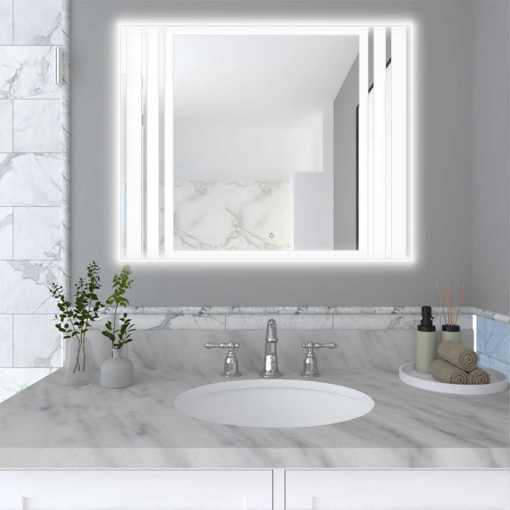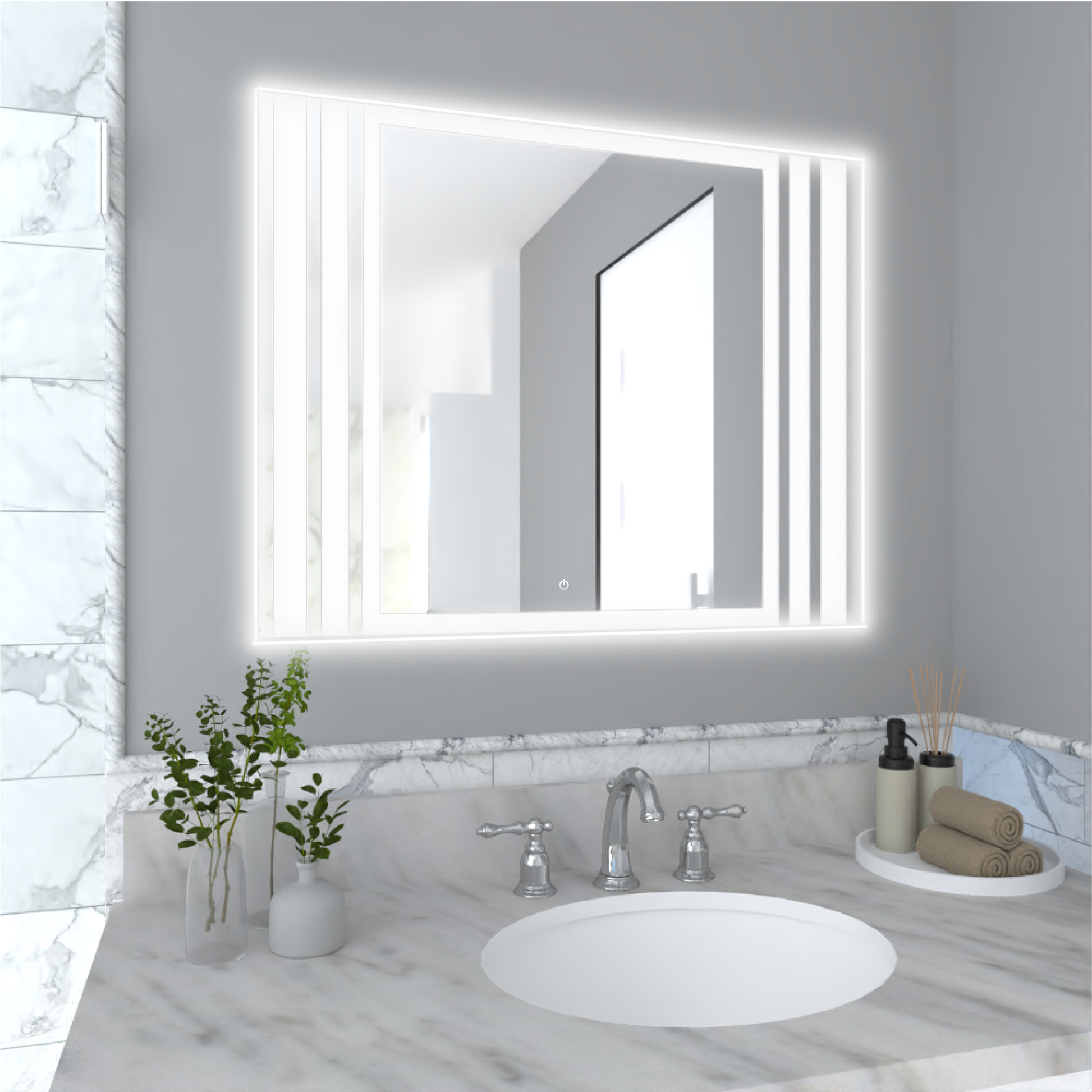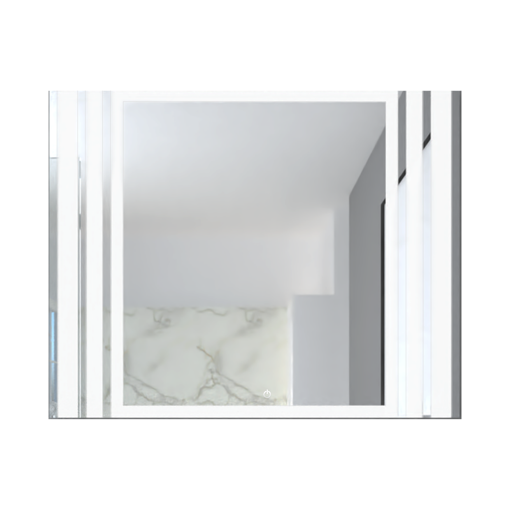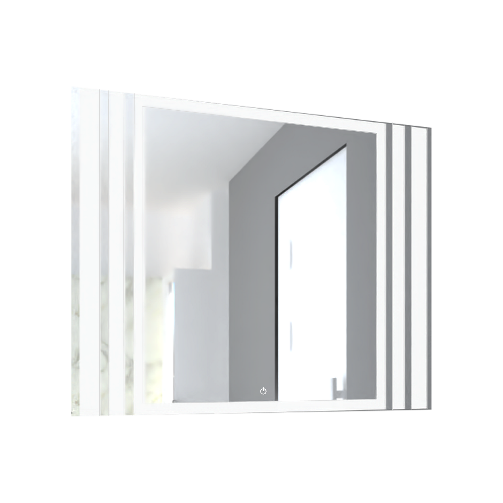 Espejo rectangular con lineas verticales en sandblasting, con luz led+touch y ensamble a pared con chaflan.