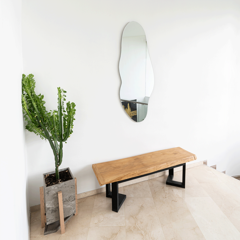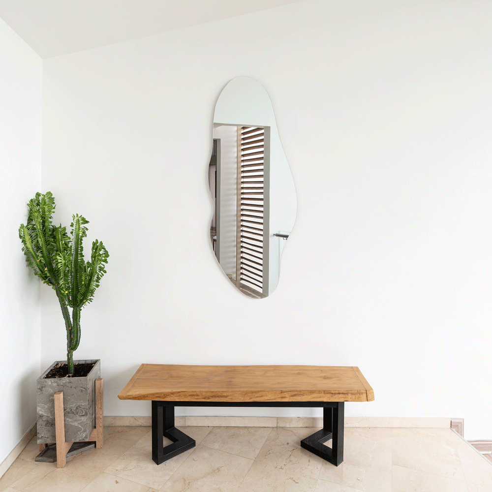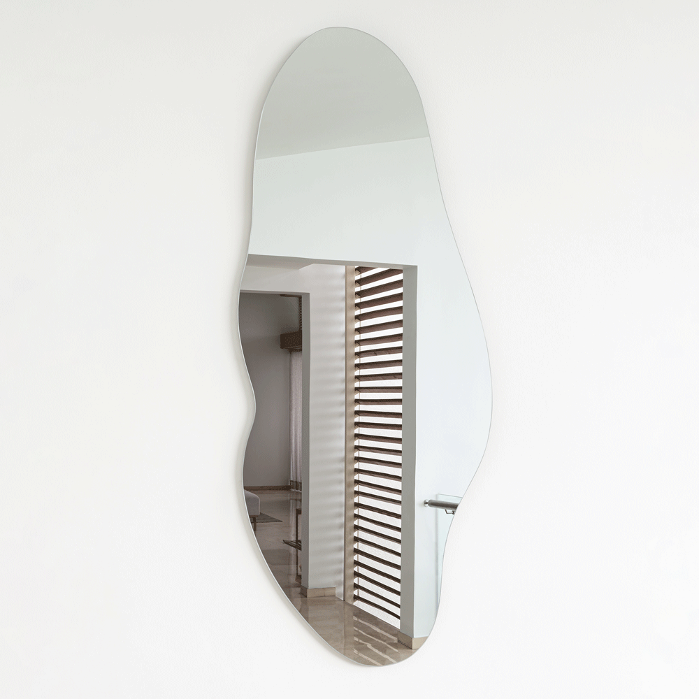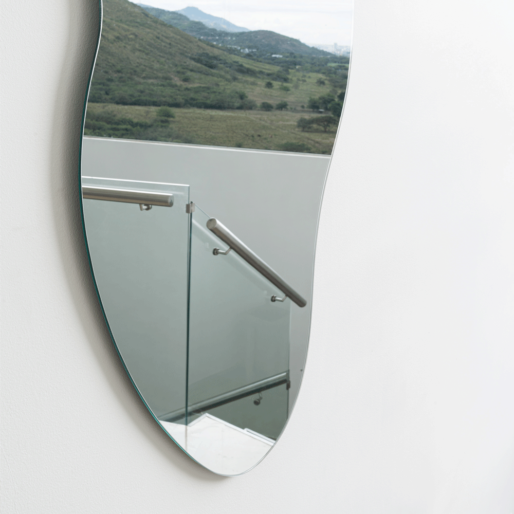 Espejo con forma irregular con ensamble a la pared con chaflán.