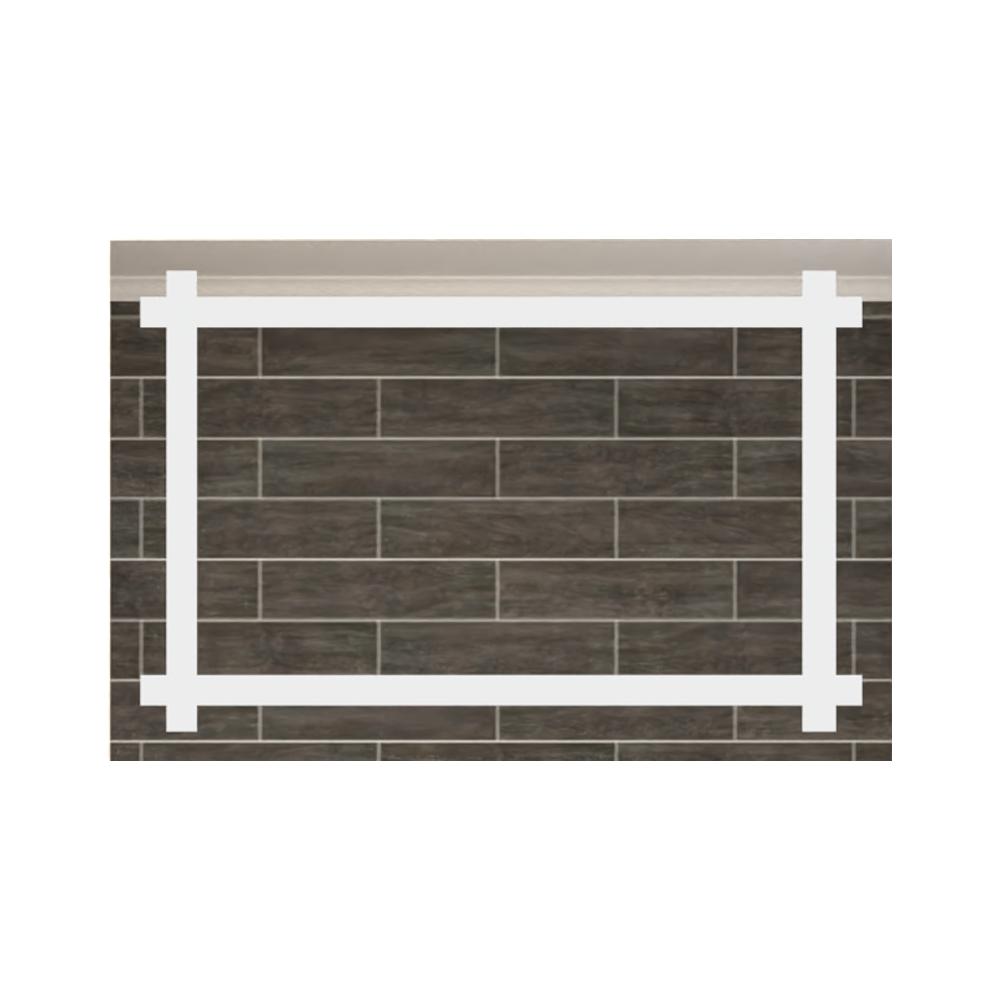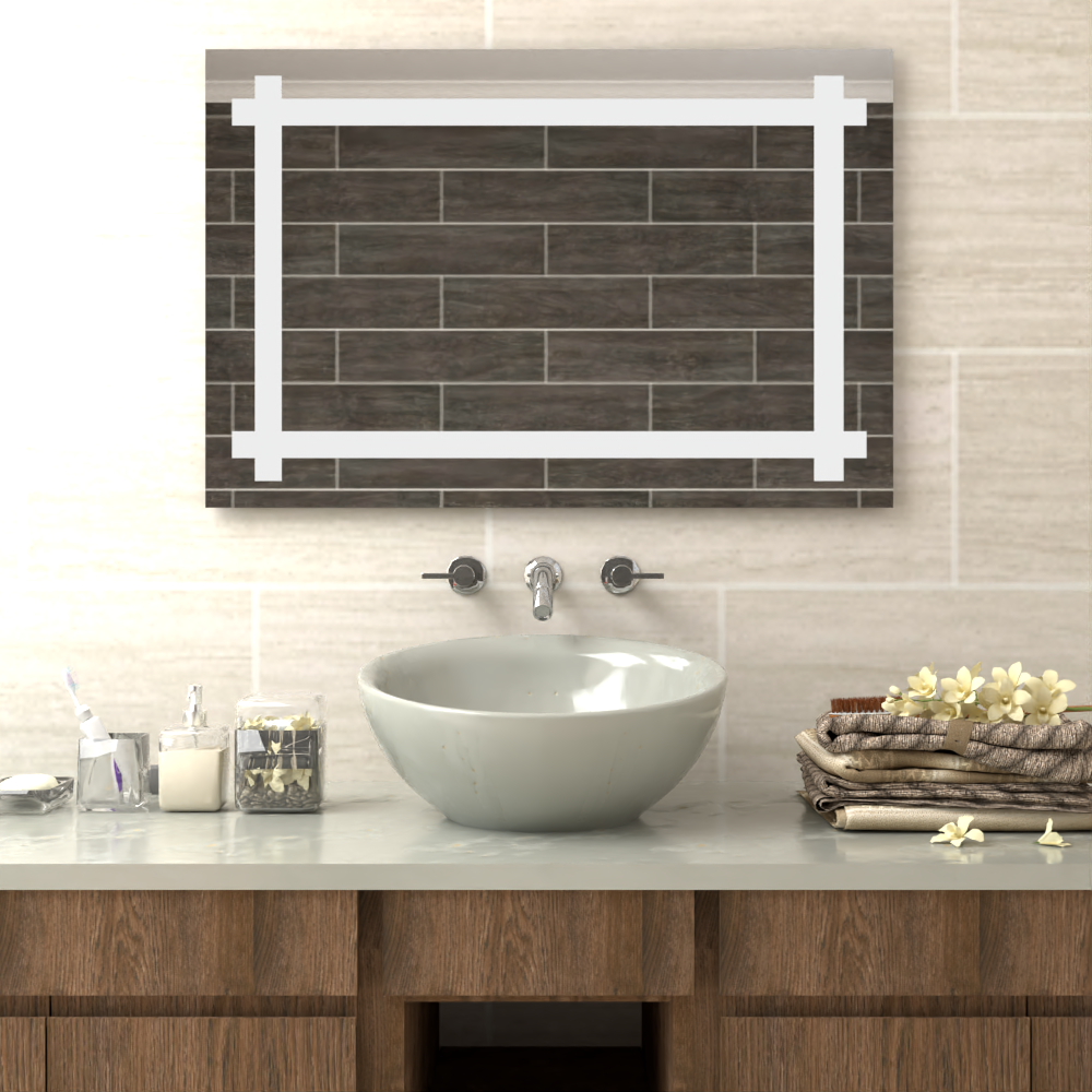 Espejo rectangular con diseño interno en sandblasting, y ensamble a pared con chaflan.