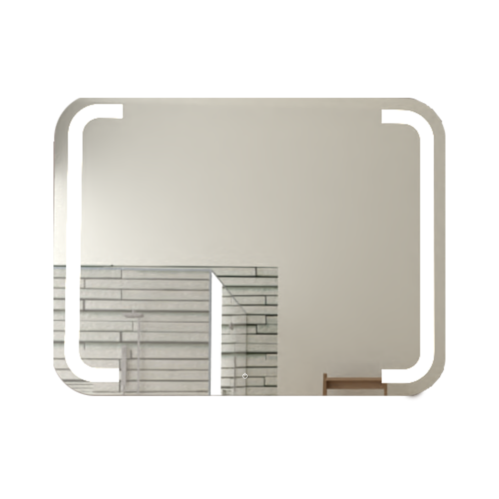 Espejo rectangular con esquina redondeadas, con diseño interno en sandblasting, con luz led+touch, y ensamble a pared con chaflan.
