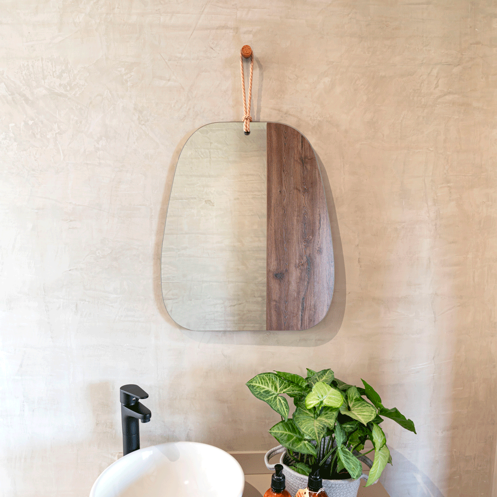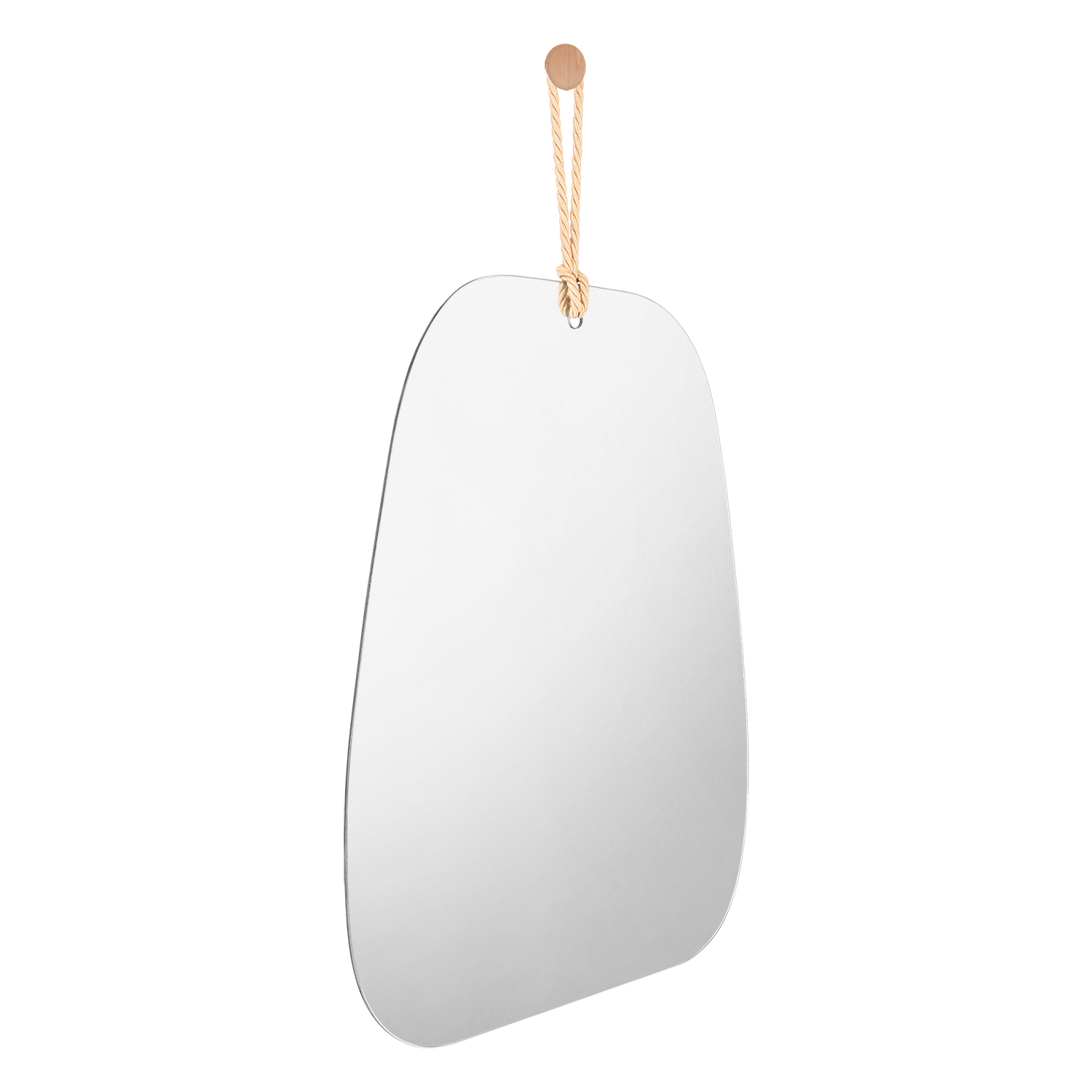 Espejo rectangular con bordes redondeados en Cal 4mm con perforación para cabuya, incluye tope en madera para lazo decorativo.