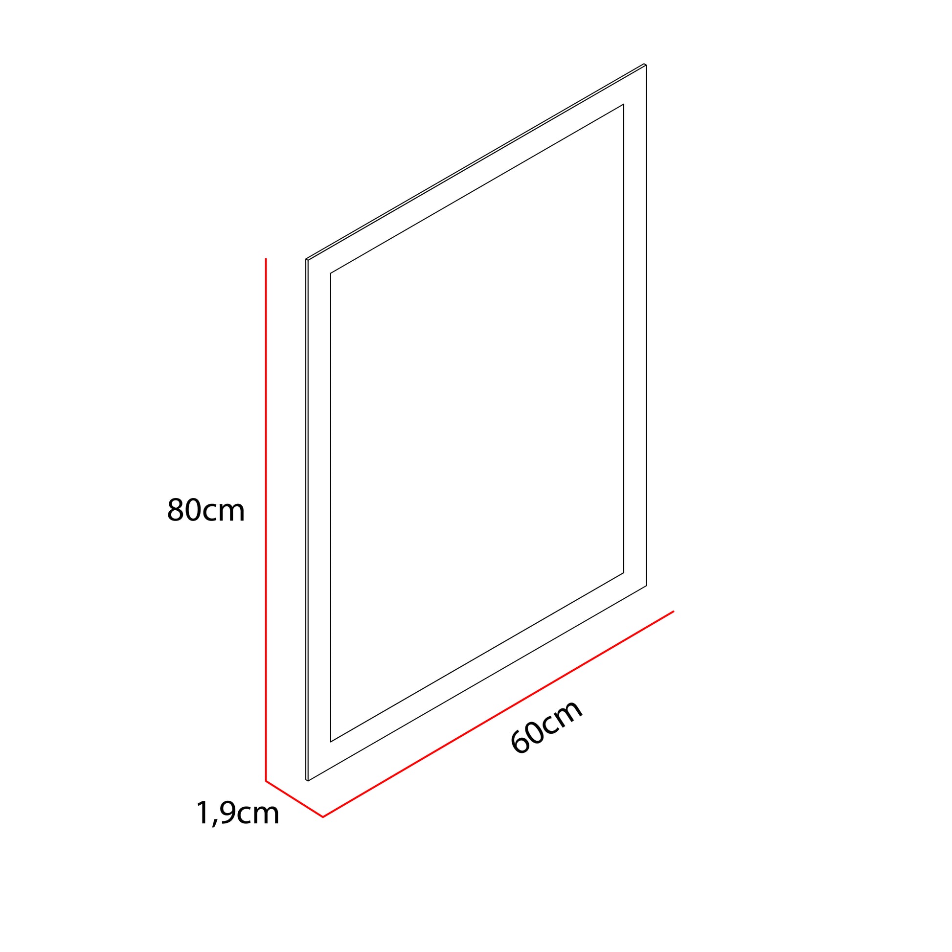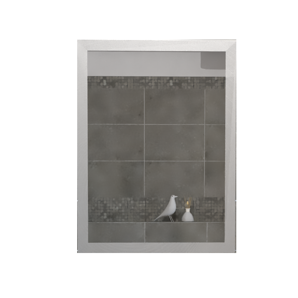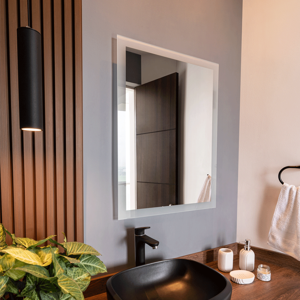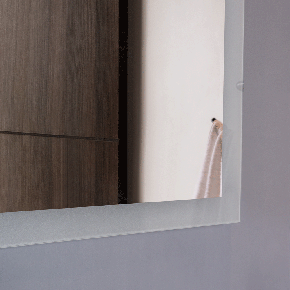 Espejo rectangular con sandblasting lateral, y ensamble a pared con chaflan.