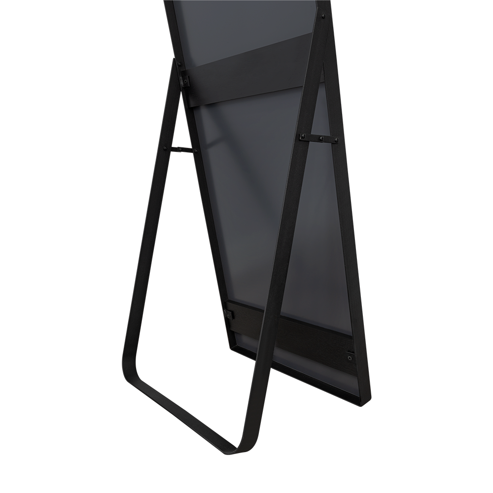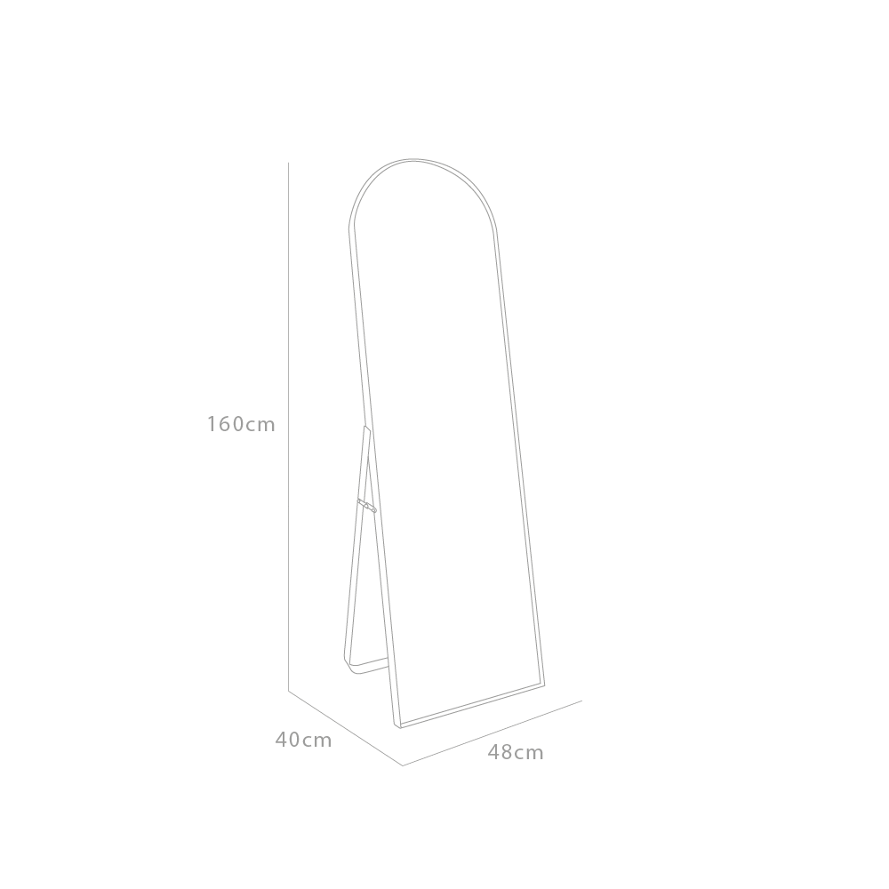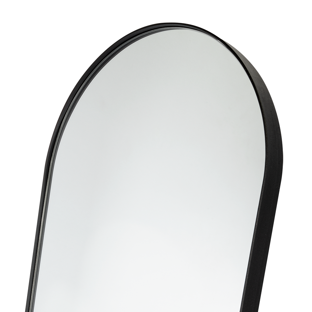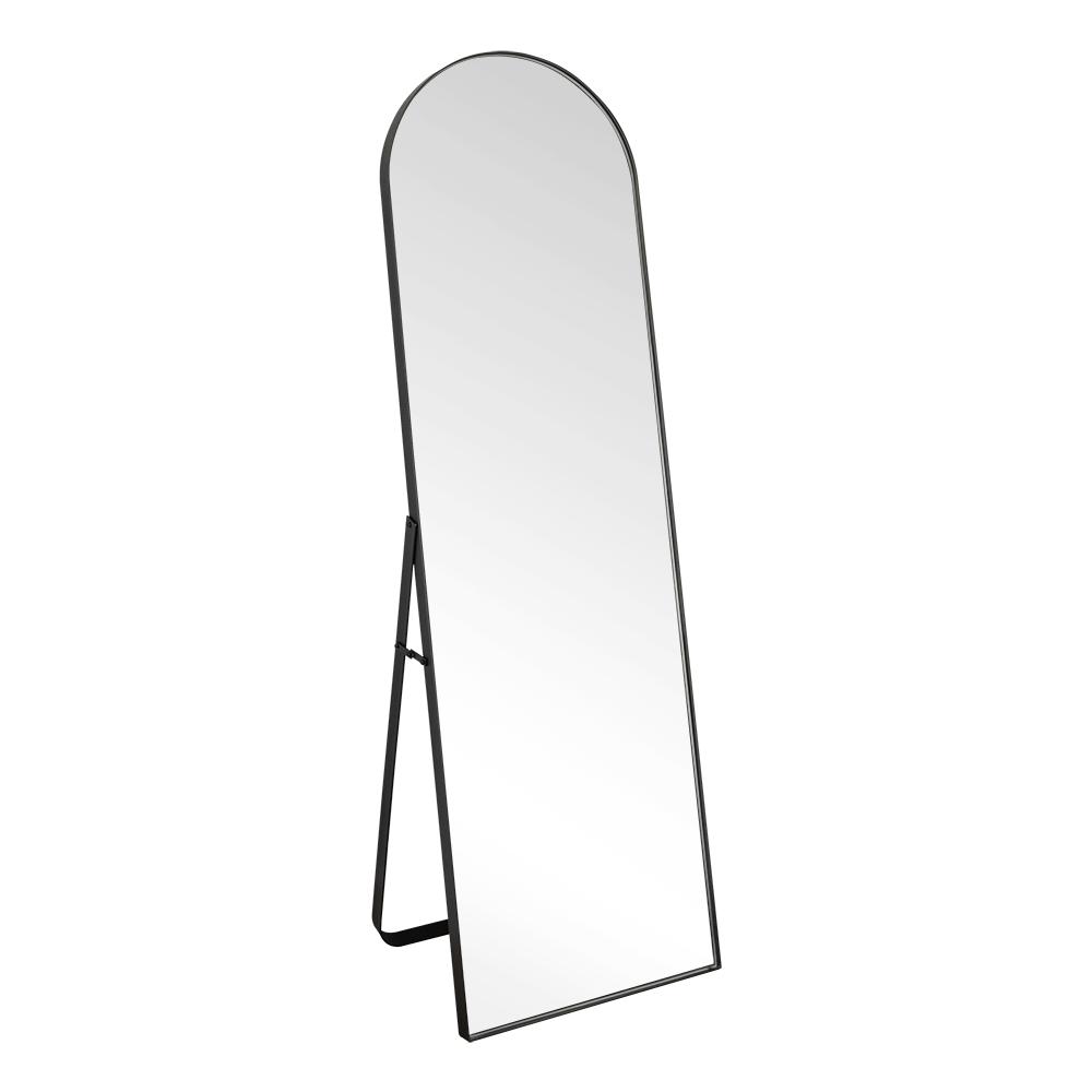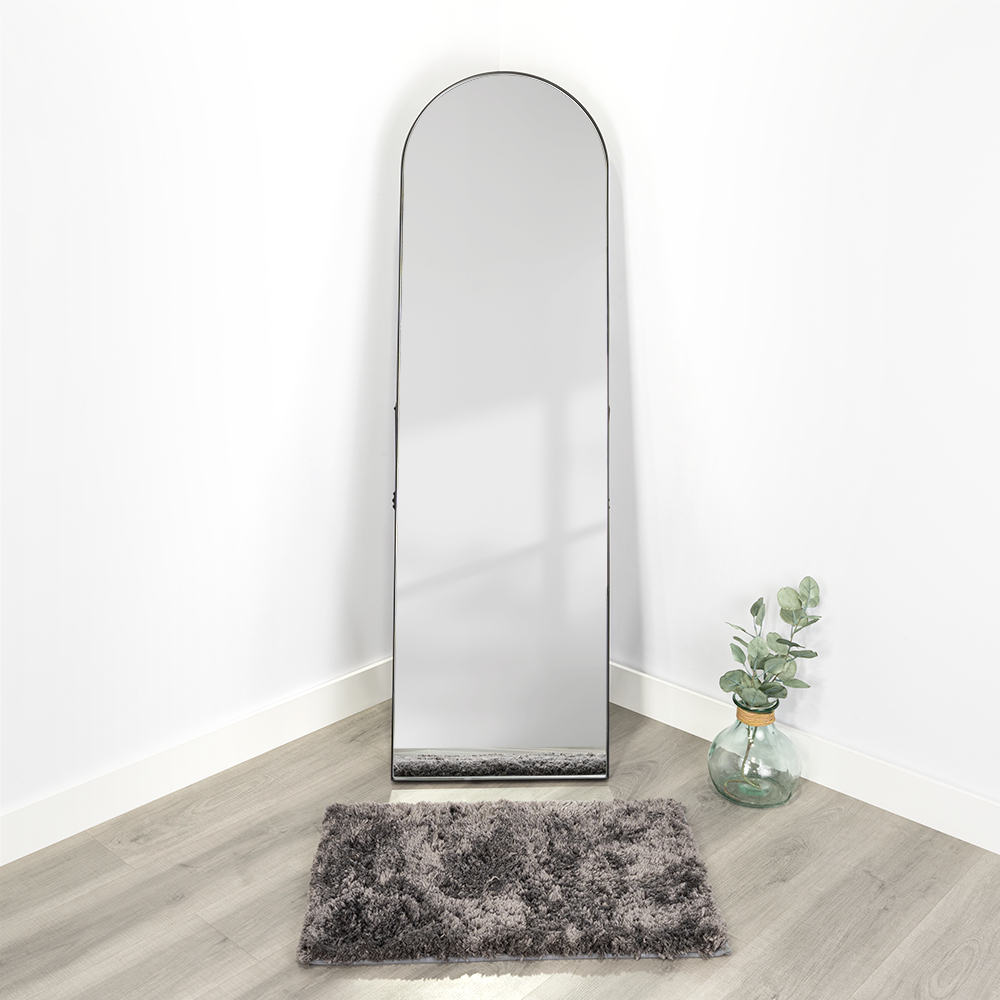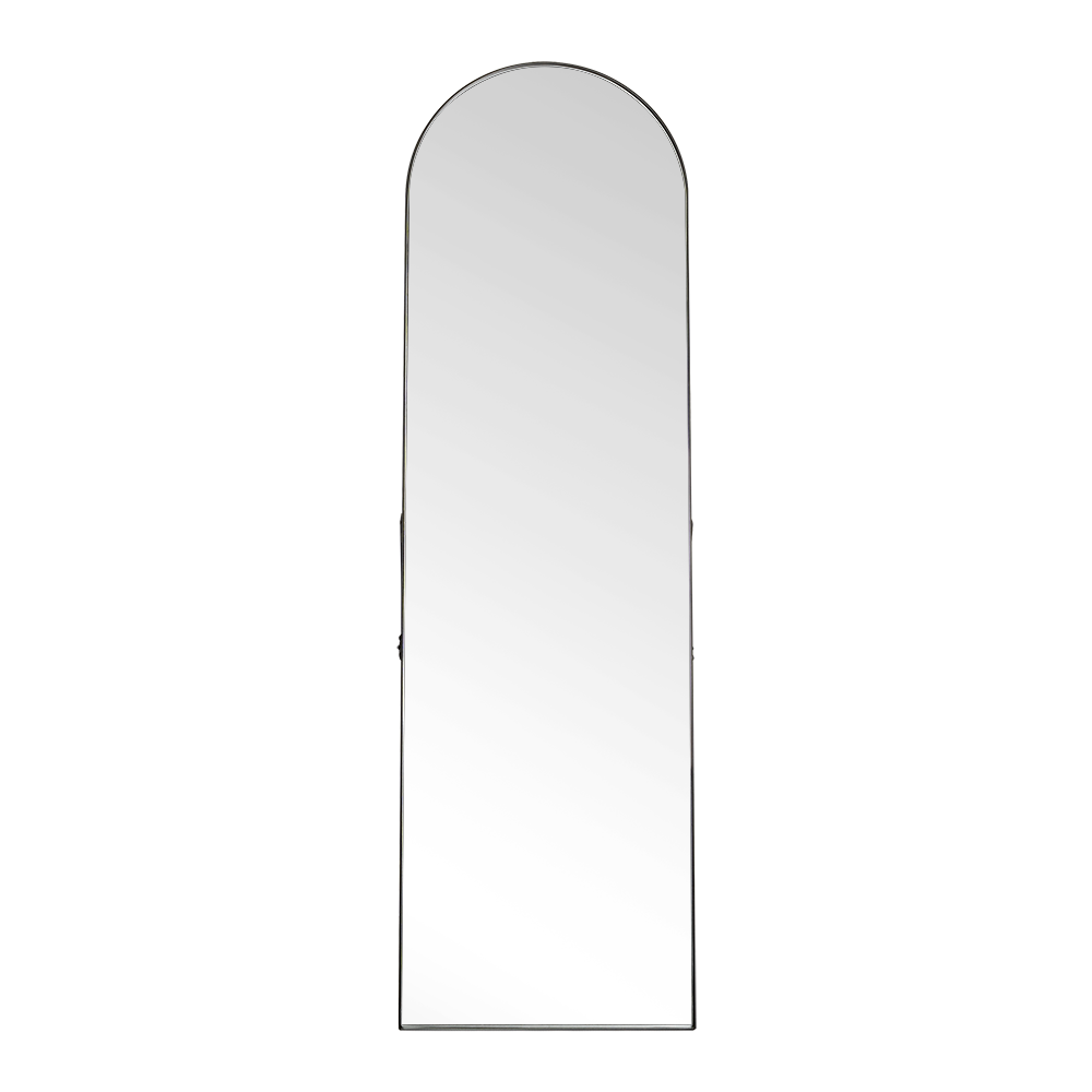 Espejo decorativo para poner en el piso o colgar a pared, su forma es rectangular con semicírculo en la parte superior, cuenta con marco metálico color negro.