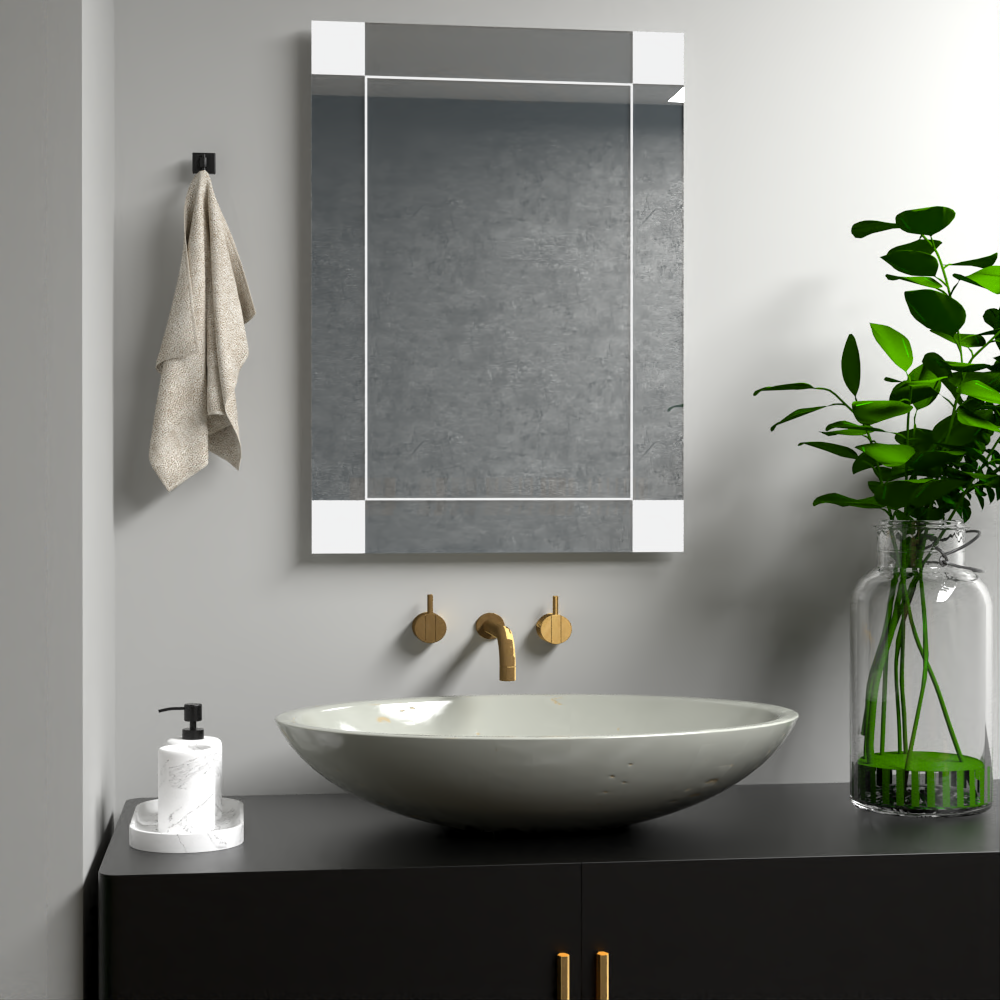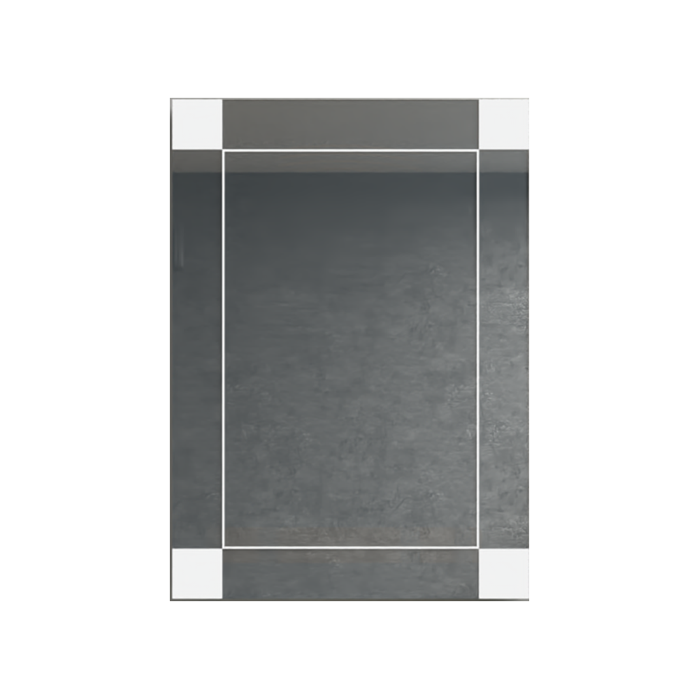 Espejo rectangular con diseño en sandblasting, ensamble a pared con chaflan.