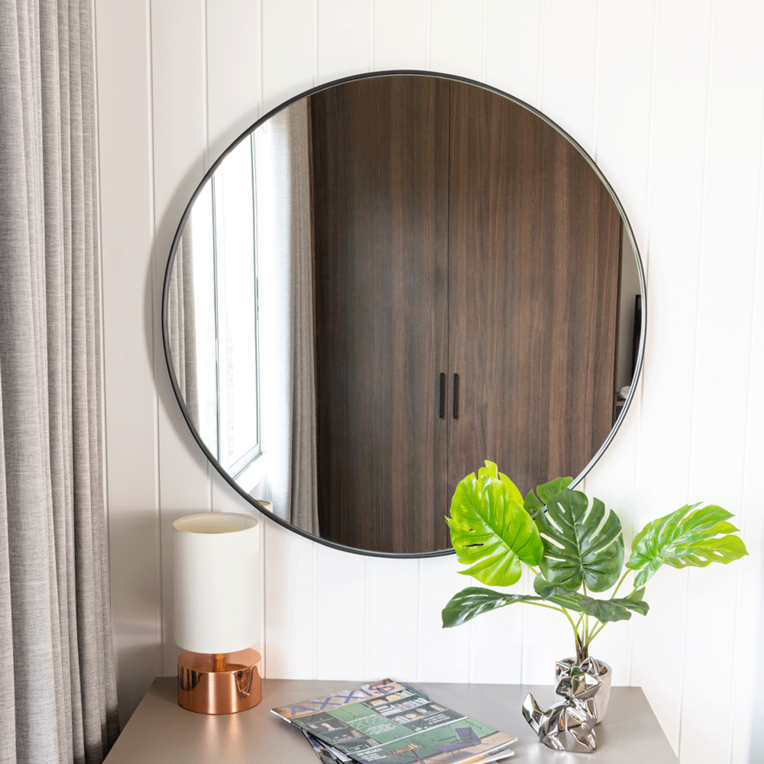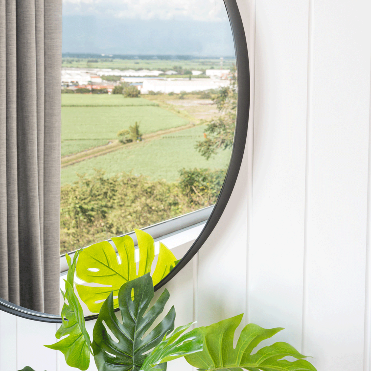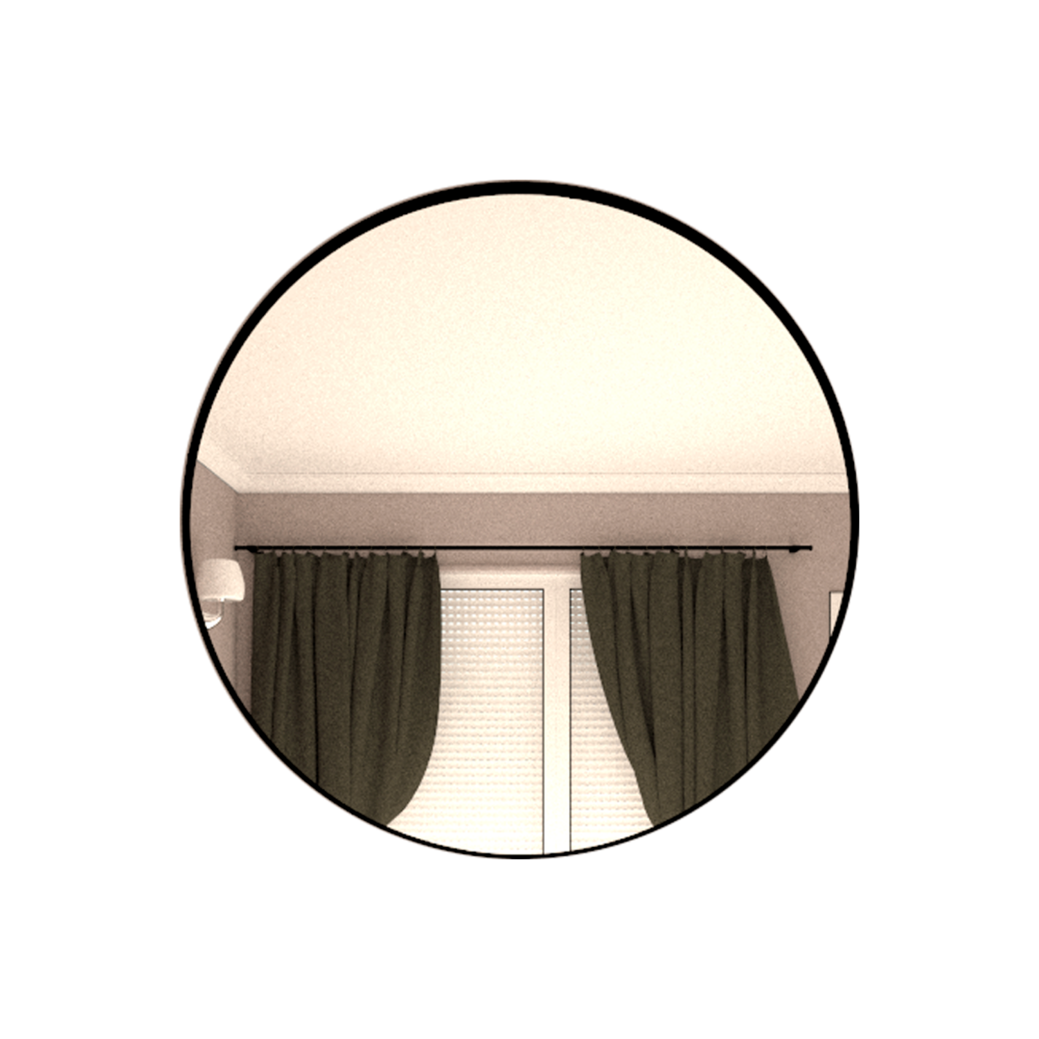 Espejo circular con estructura metalica, ensamble a pared con chaflan.