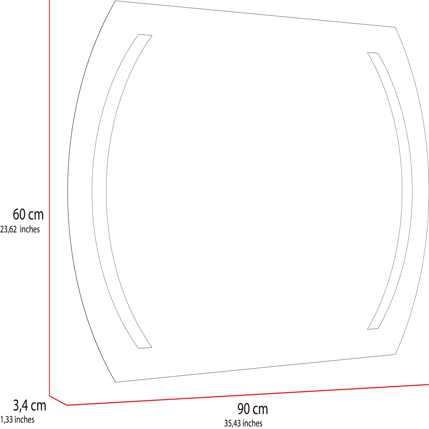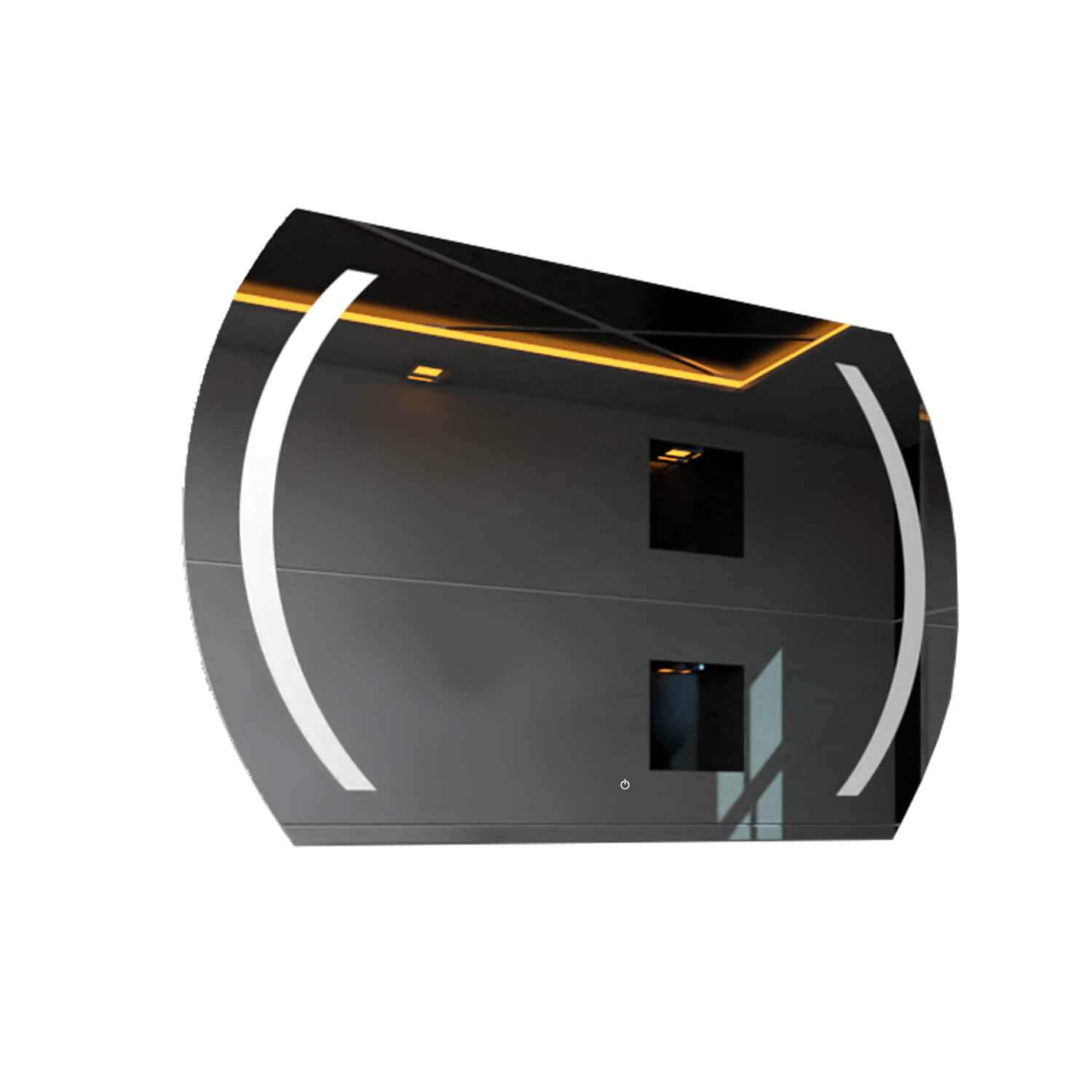 Espejo rectangular con extremos laterales curvos, con diseño en sandblasting, luz led+touch y ensamble a la pared con chaflan.