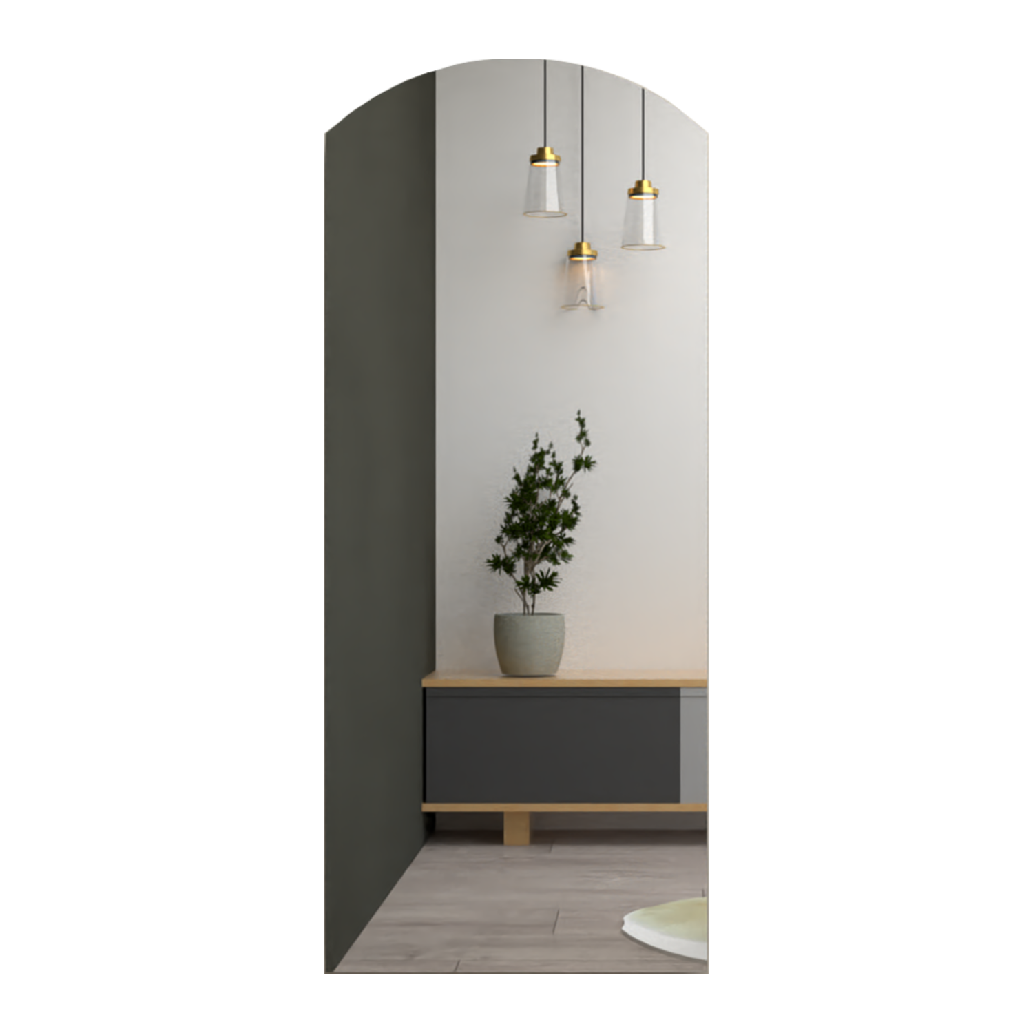 Espejo rectangular con extremo superior en semicírculo, y ensamble a la pared con chaflan.