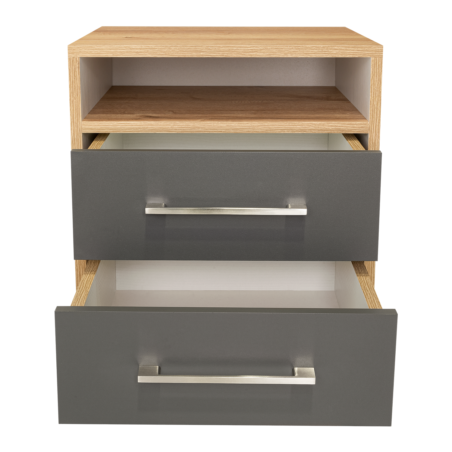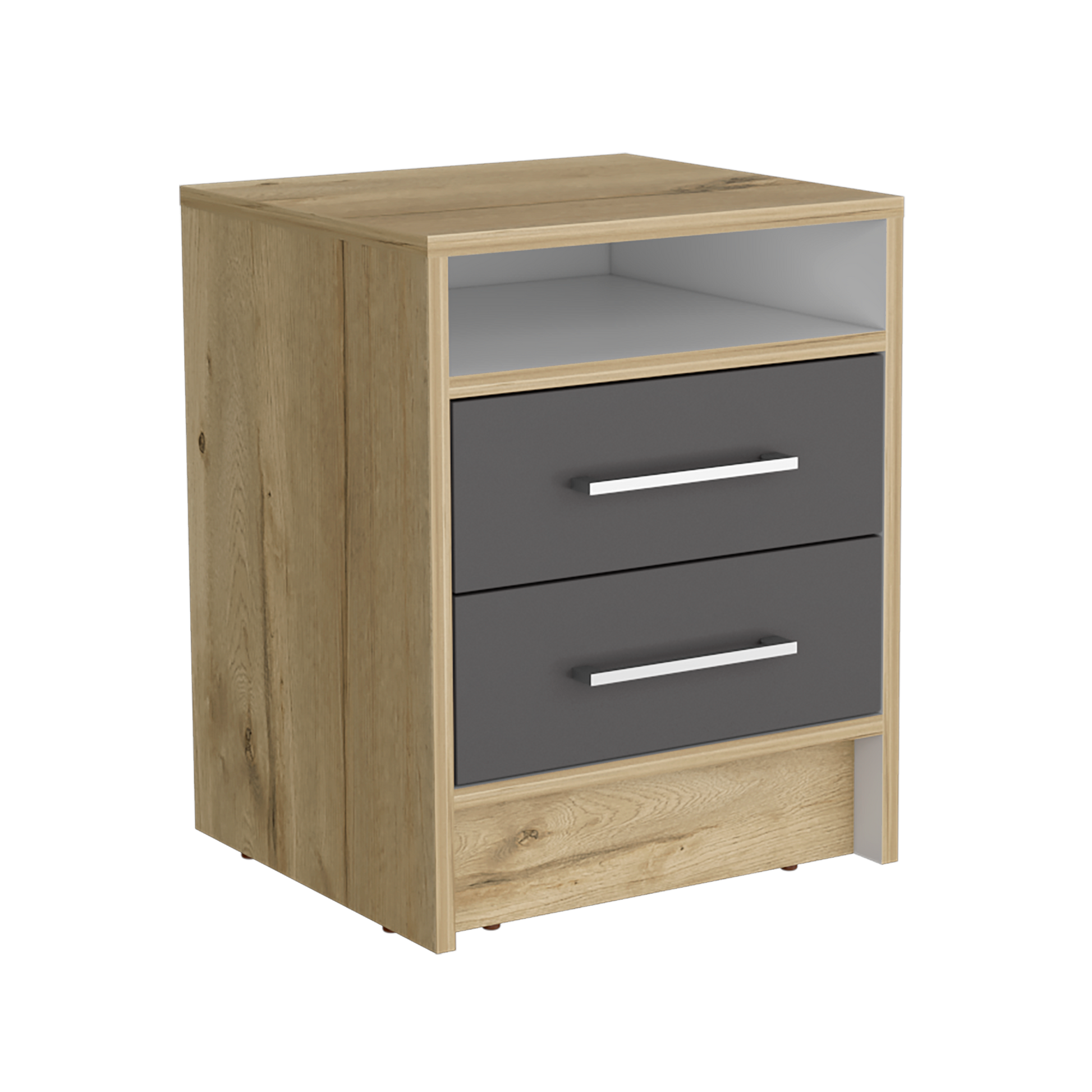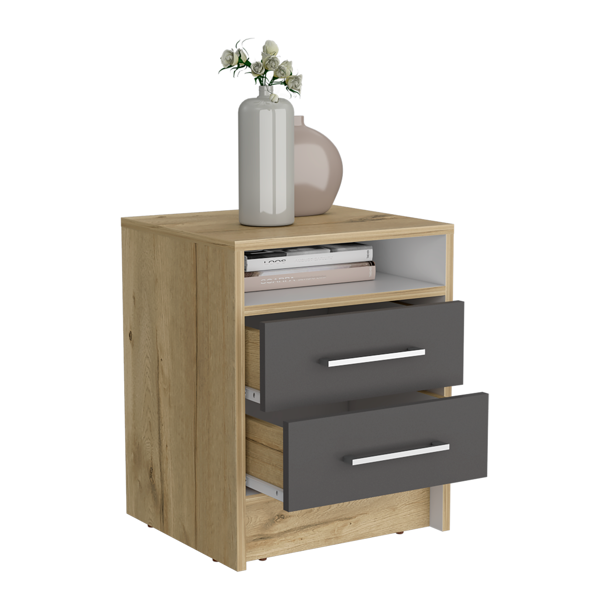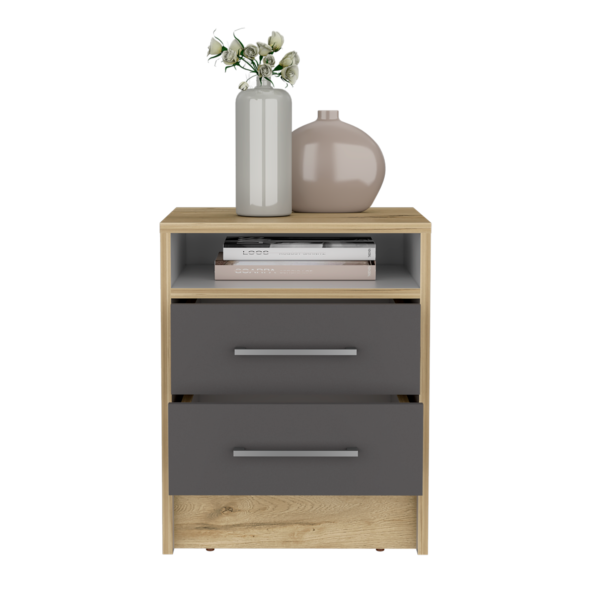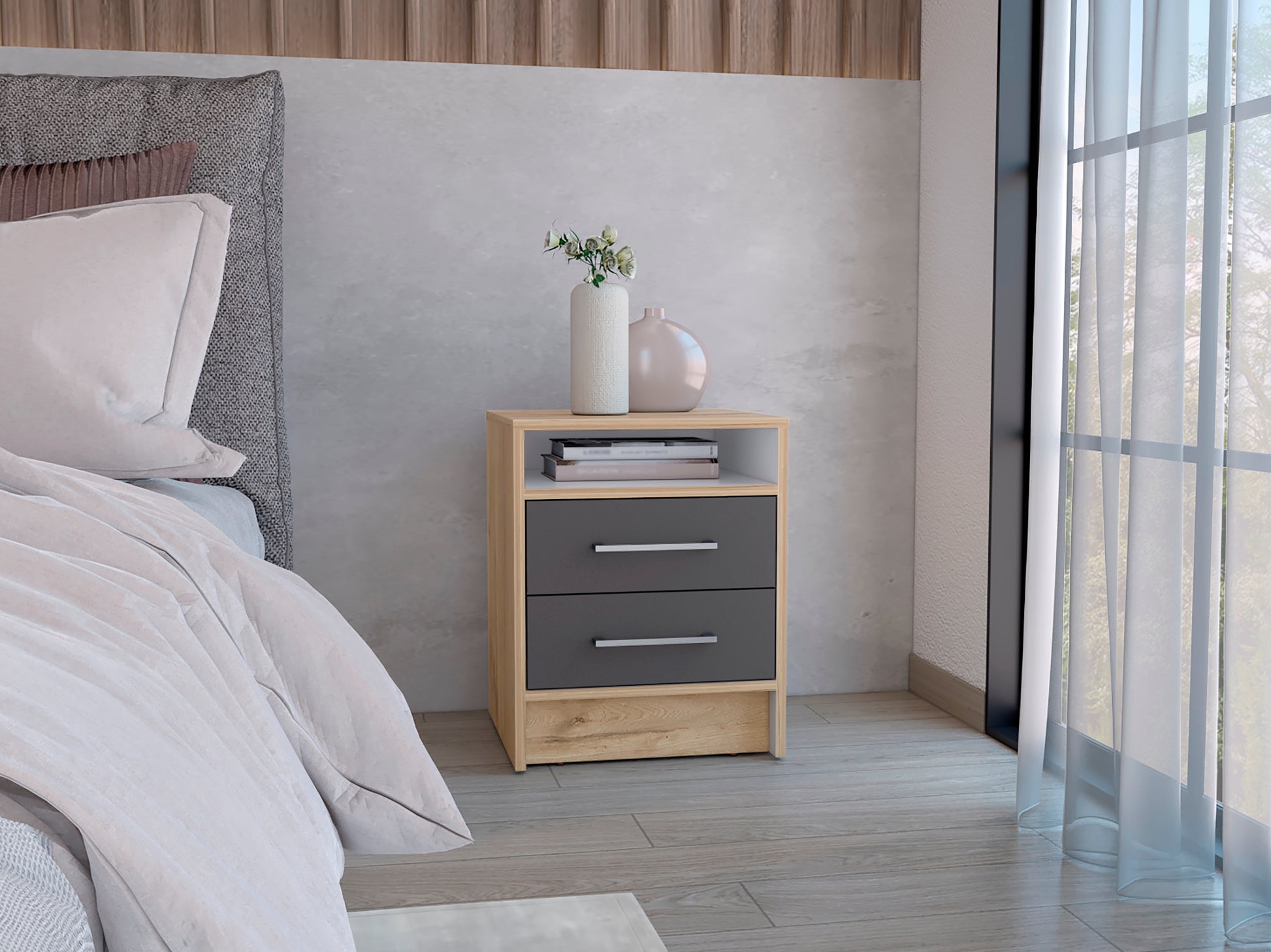 Mesa de noche con manijas metalicas, dos cajones, espacio para libros y objetos decorativos