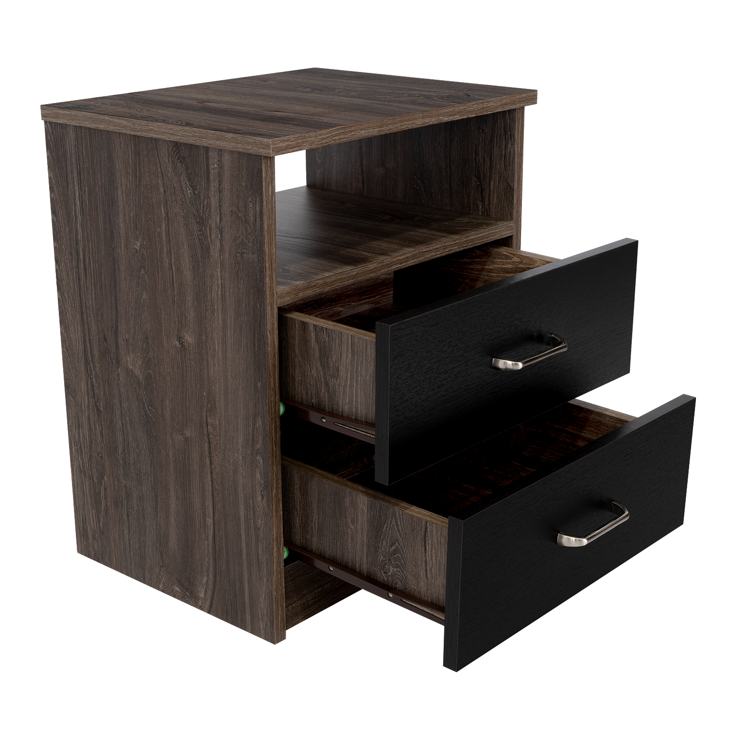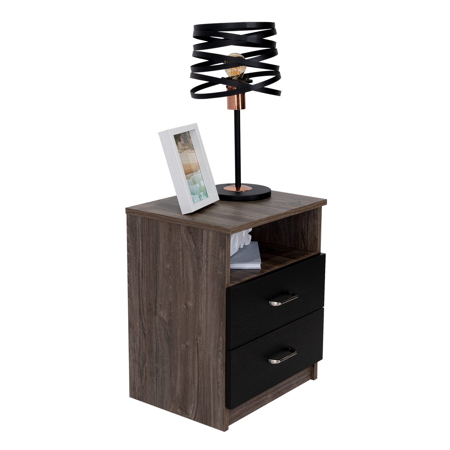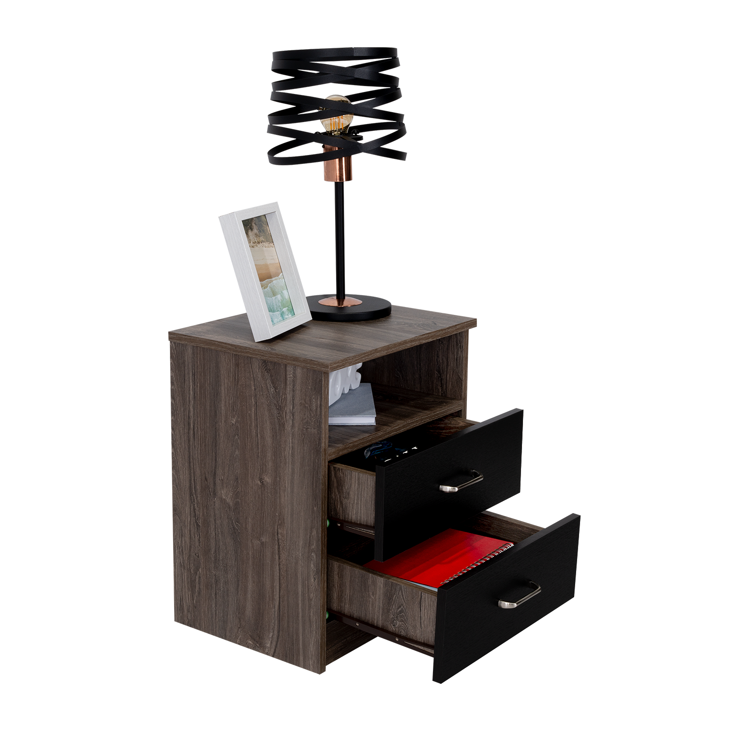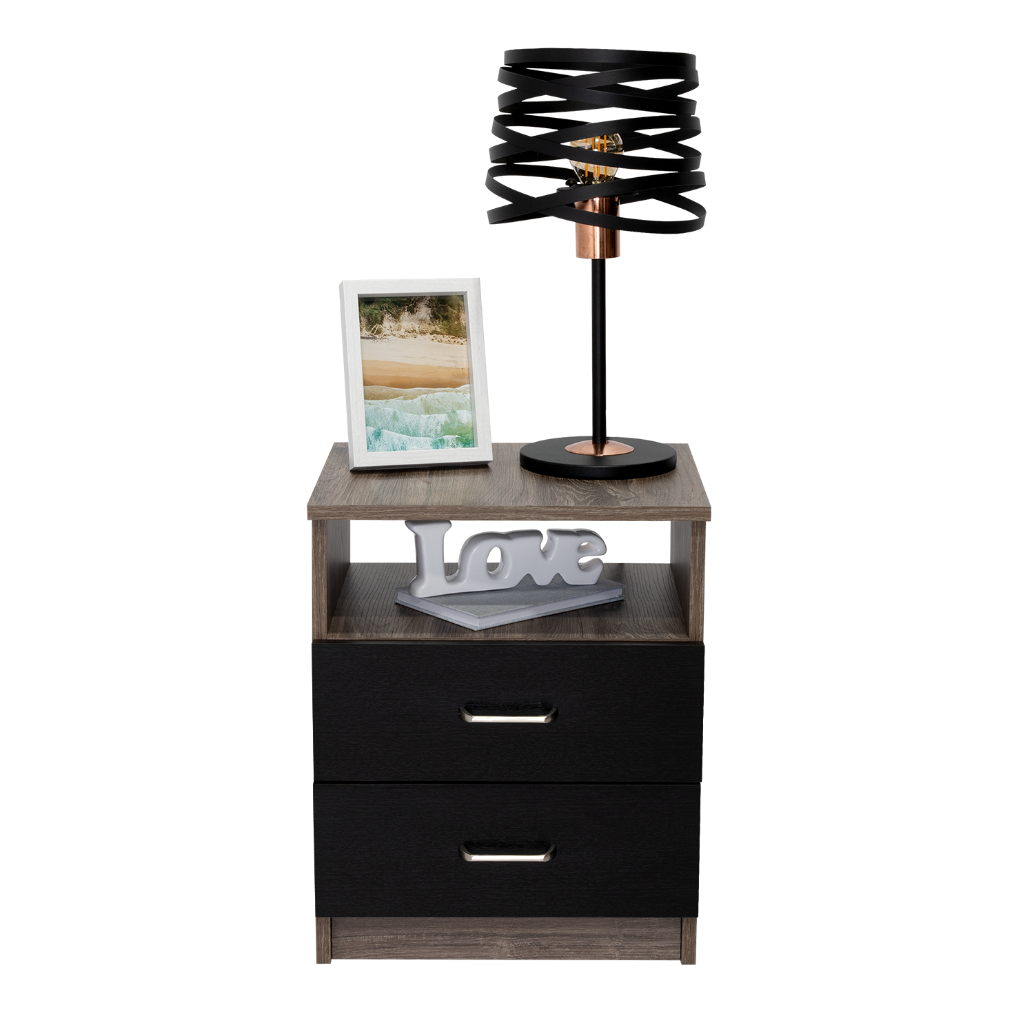 Mesa de noche con diseño practico y funcional, espacio para objetos decorativos como lamparas entre otros, dos cajones, deslizables con correderas metalicas, manija metalica semi arco, facil armado e instalado