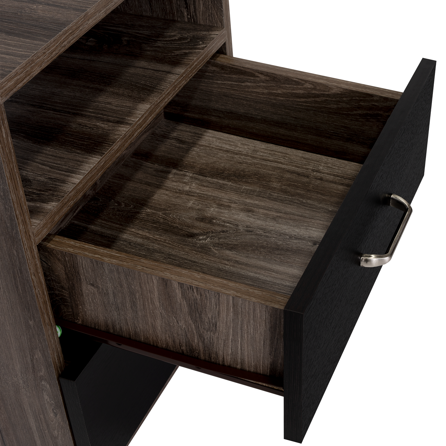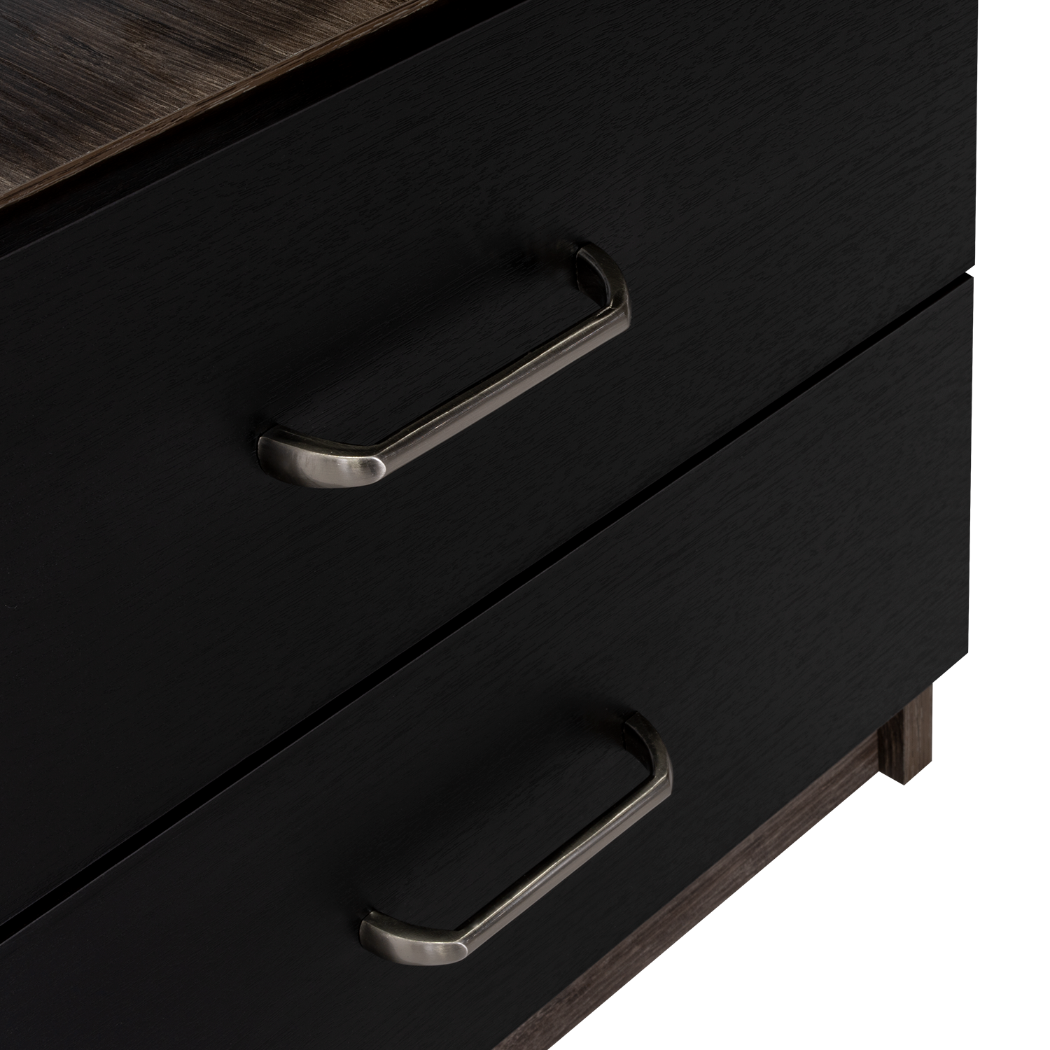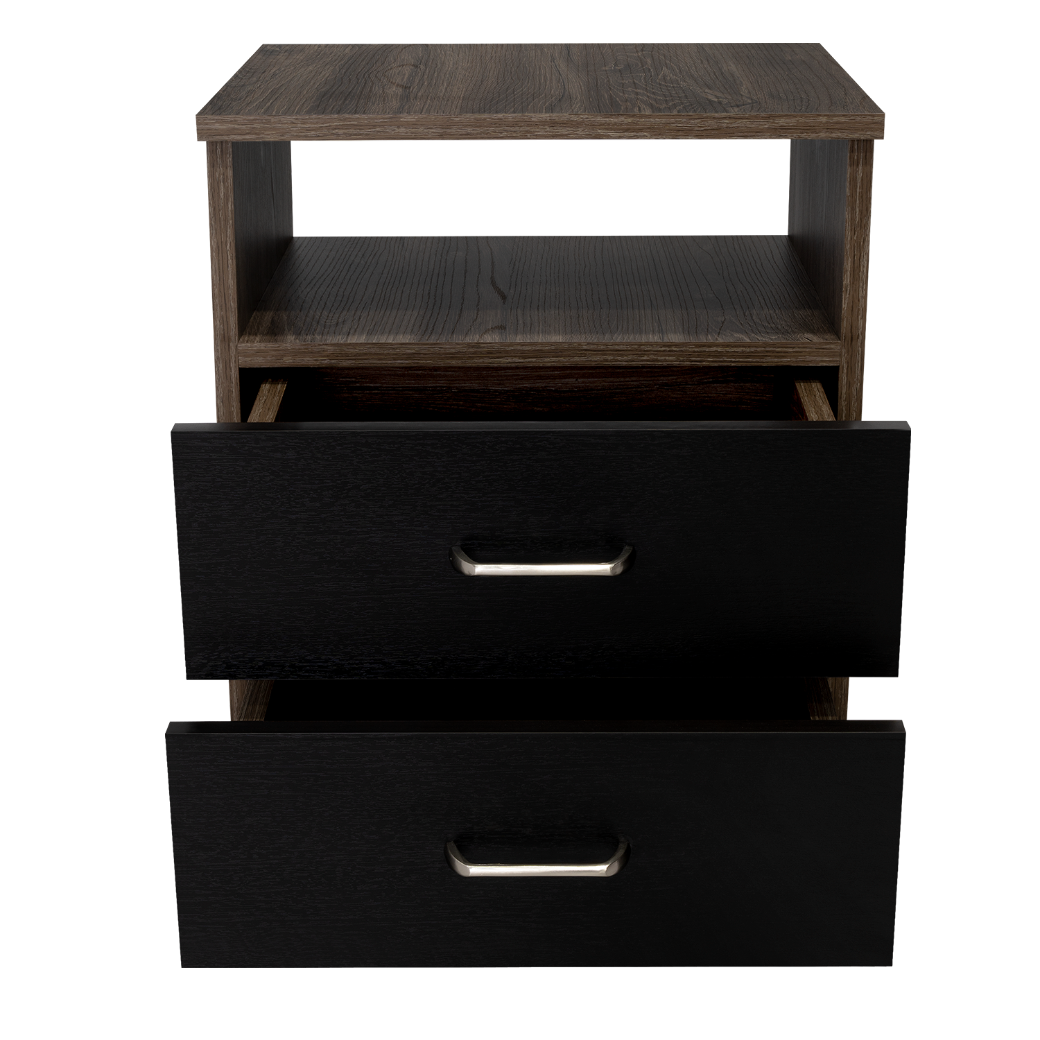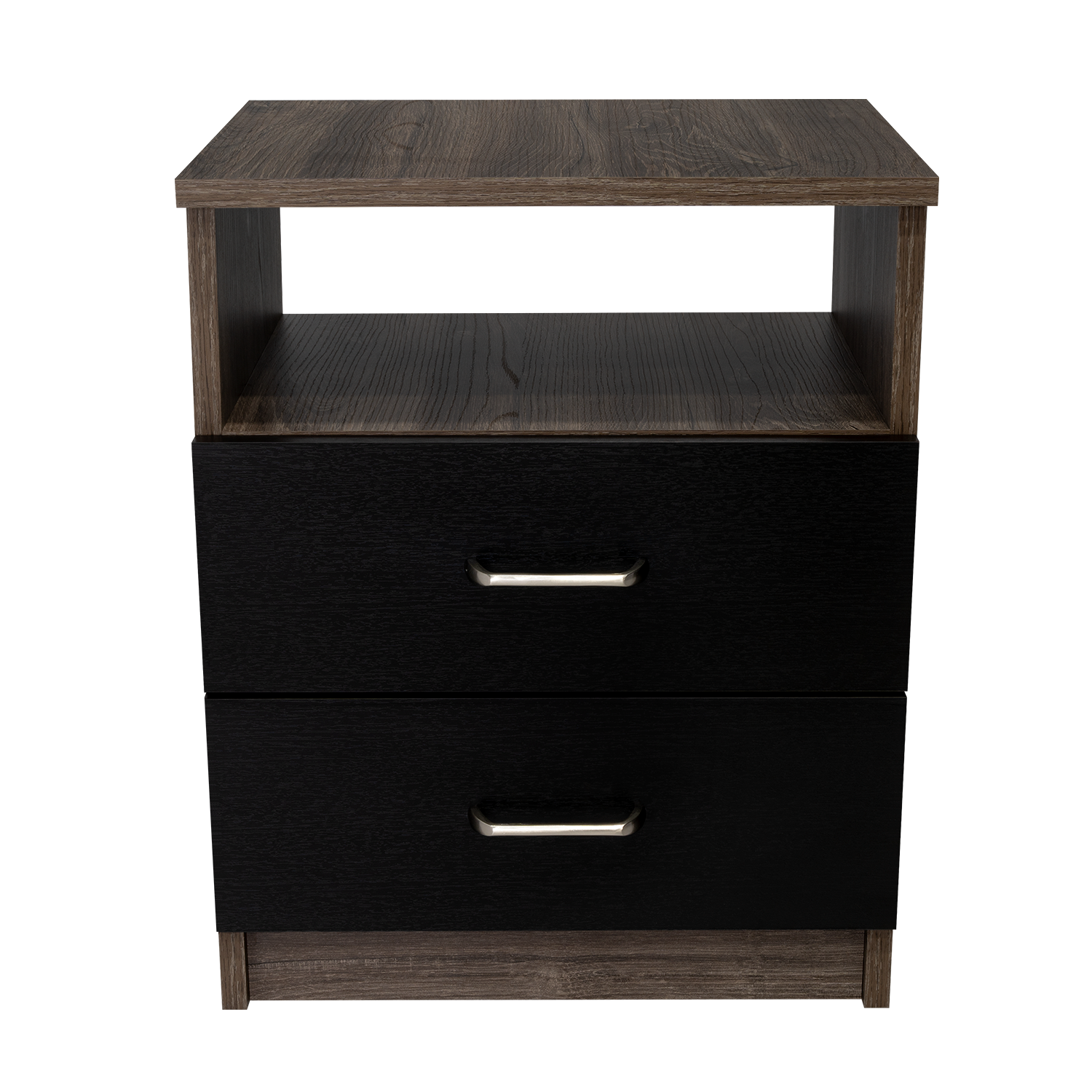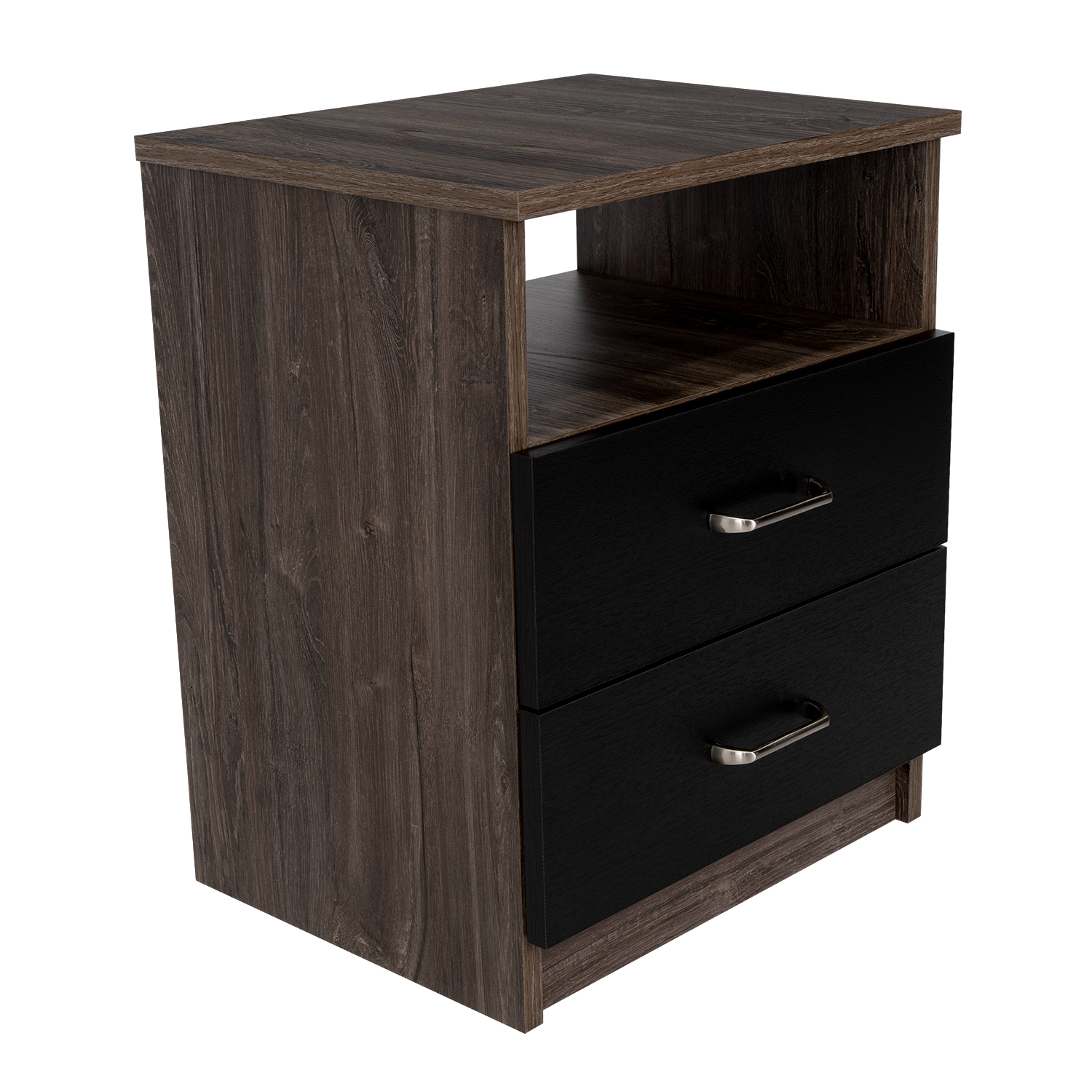 Mesa de noche con diseño practico y funcional, espacio para objetos decorativos como lamparas entre otros, dos cajones, deslizables con correderas metalicas, manija metalica semi arco, facil armado e instalado